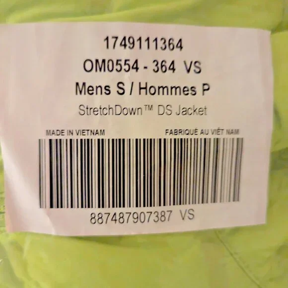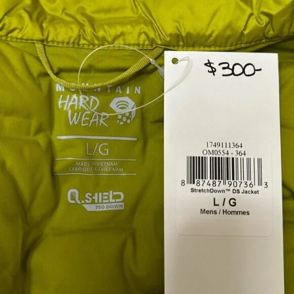 Mountain Hardwear discontinued its superior 'DS' version of the Stretchdown Jacket. The new and current Stretchdown Jacket has half the insulation and loft as this DS version. It's down is coated with hydrophopic material, repelling moisture, which their current model no longer has. This is a vastly superior jacket and will last for many years.This Mens Small is comparable to the Womens Medium, with the shoulders being a bit wider in the Mens. Jacket is NEW and unworn.New this jacket was $300. Selling it for half price!Mountain Hardware StretchDown DS Jacket - Fresh Bud (Lime) solid lime*Dynamic Stretch Knit (100% Polyester)Insulation: NIKWAX Hydrophobic Down 800-fill RDS Cert/Fluorine Free (90% Goose Down / 10% Goose Feather)*Active Fit*An even stretchier version of theinstant classic StretchDown Jacket.*The DS breaks free of the dried pattern w/ standout style & discontinuous lines. Looks & feels awesome.*Warm, light, incredibly stretchy knit fabric is vastly more comfortable than conventional down jackets.*Groundbreaking stretch-welded channel constratction traps more warmth than standard stitching.*NIKWAX Hudrophobic Down 800-fill resists moisture & retains maximum loft.*Zippered hand-warmer pockets, zippered left chest pocket, & 2 easy-access interior drop pockets.*Smart dual-sided hem adjustment.*Avg weight: 1lb, 2.3ozNEW w/ tags, excellent condition