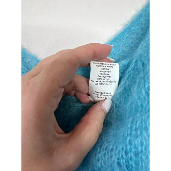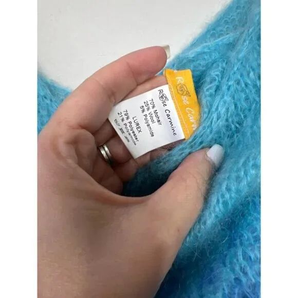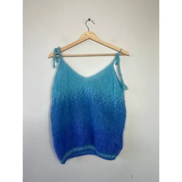 Rose Carmine Bretelles Blue Ombré Mohair-Blend Tank Top. New without tag!Size: S/MA cozier take on your go-to tank, the label hand knits their Bretelles camisole in ombré blend of mohair with stripes of lurex. Tie shoulder straps.Fabric: 70% kid mohair, 30% polyamideCombo: 80% viscose, 20% polyamideHand wash coldLength from shoulder to hem: 25"tank, crochet, mohair, cozy, top, ombre, resort, resortwear, spring, fall, winter, casual, everyday, designer, rosecarmineRose Carmine Bretelles Blue Ombré Mohair-Blend Tank Top