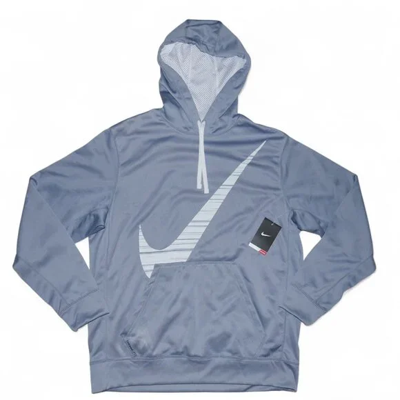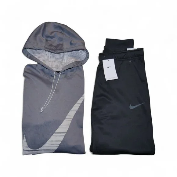Nike Men's Size L-XL Therma-Fit Sweatsuit Hoodie Joggers 2 PC Outfit Set NWTSize XL Hoodie Size L Jogger100% AuthenticManufacturer Description:Made with insulating, sweat-wicking fabric, this Nike Therma Sweatsuit helps keep you warm and comfortable before, during and after your workout. A Kangaroo pocket at the front keeps your phone easy to access.Nike Therma fabric helps manage your body's natural heat to keep you warm.Dri-FIT technology helps you stay dry and comfortable.Kangaroo PocketSoft Brushed-back Fleece Offers Smooth Comfort On Your Skin And Lightweight Warmth When You Need It.Standard fit for a relaxed, Athletic Look And Feel.Stretchy Elastic Waistband With A Drawcord allows you to be comfortableBig Swoosh Logo Across the frontElastic CuffsBody: 100% PolyesterHeather Gray/BlackNew With Tags! No Flaws/Odors.
