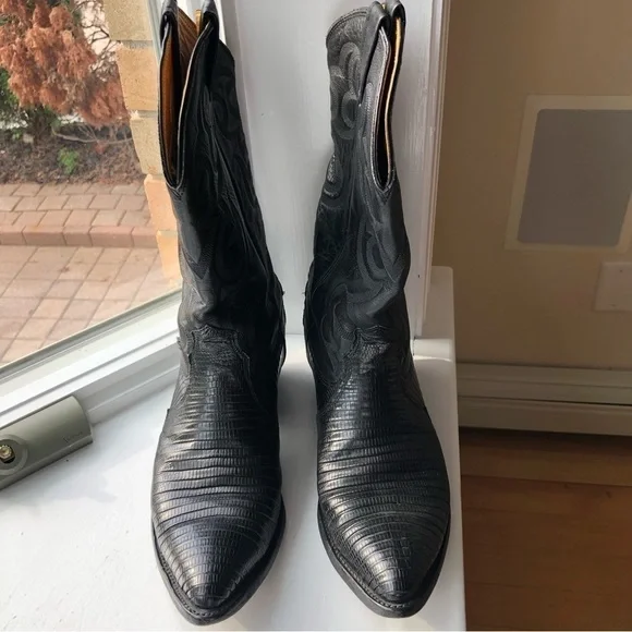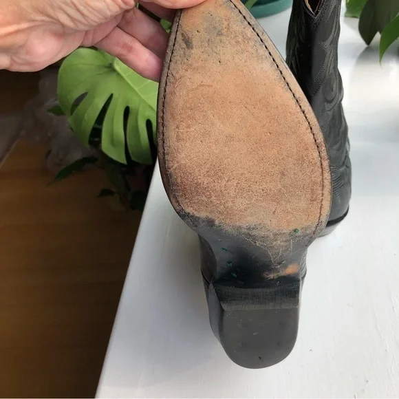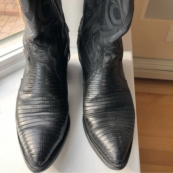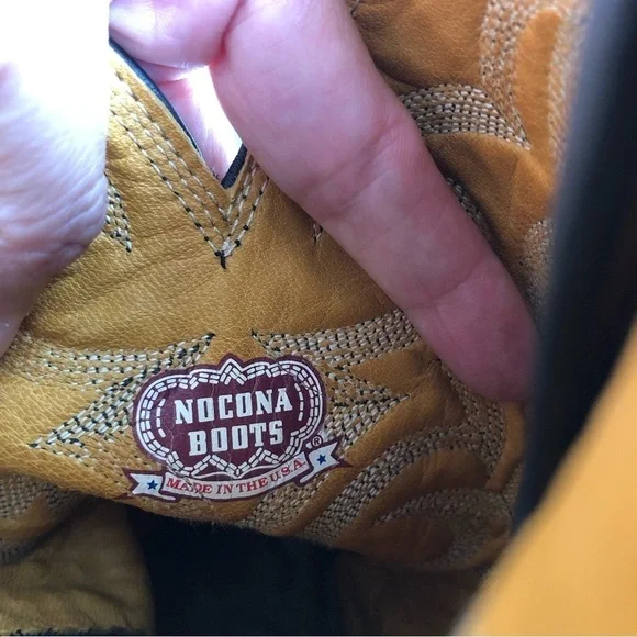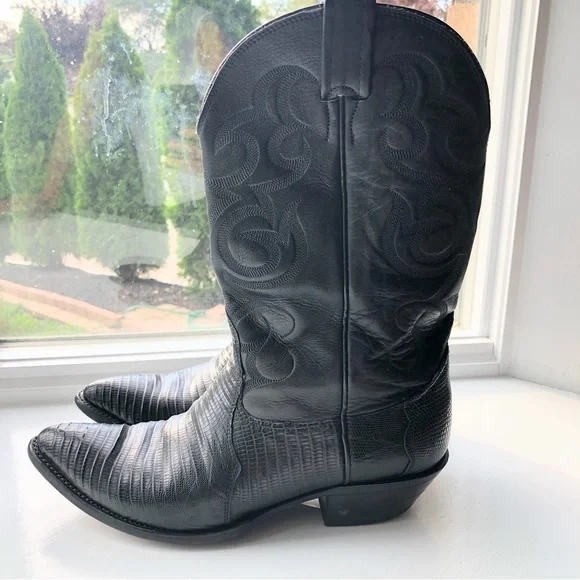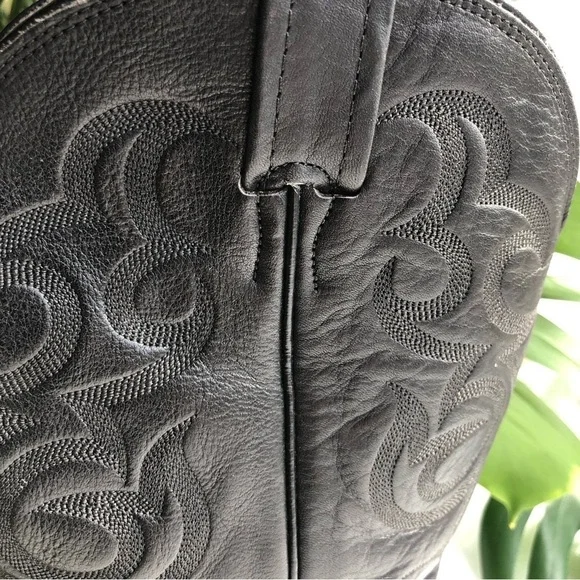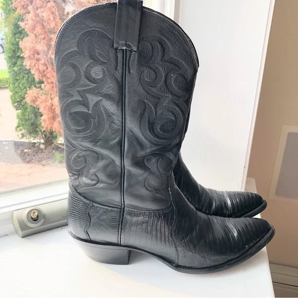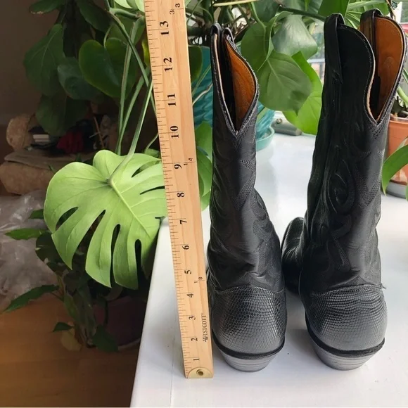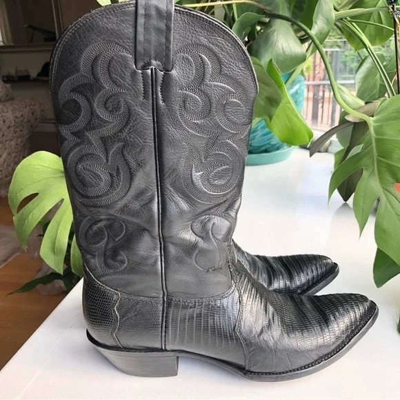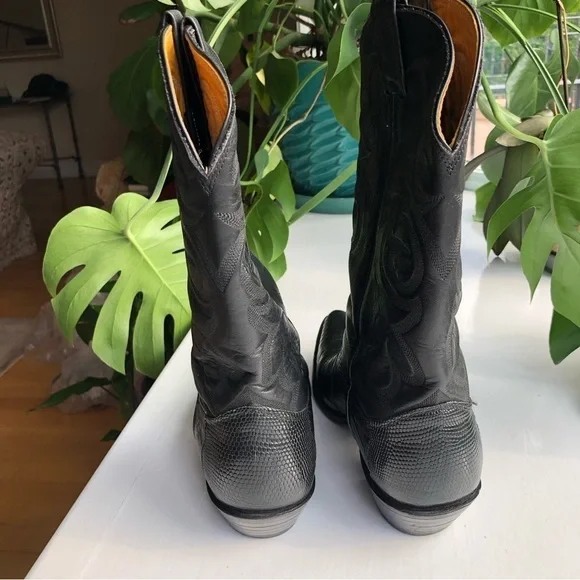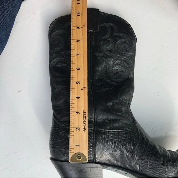 These fabulous boots were made in the USA by Nocona Boot Company makers of Western boots since 1925.These guys know how to make authentic Rodeo boots.This gorgeous pair is made from high quality black leather.On the foot you'll find a lizard grain pattern with the smooth upper having a Western style stitched design.They are a mid calve boot with pull tabs for easy on access.The inner and outer soles are made from genuine leather and guys when I tell you these boots are super soft inside and comfortable and they have already been broken in for you!The heel measures just over an inch making them comfortable for everyday wear.They are a men's size 9D which is a women's size 10.5They are in great pre owned condition.See images for more details.