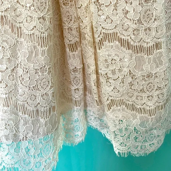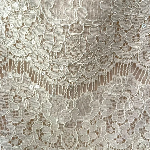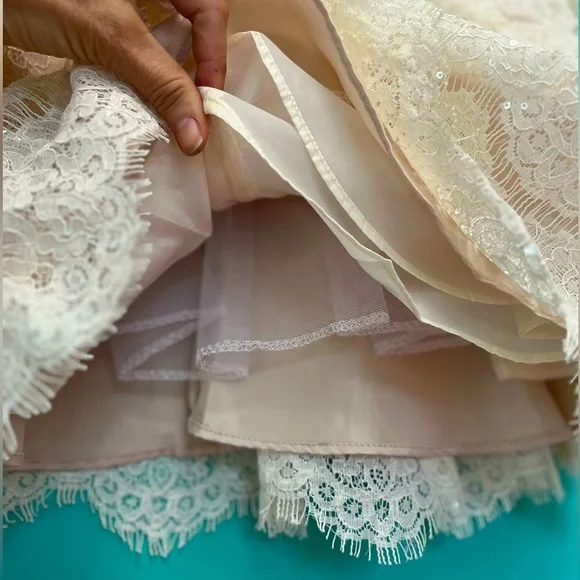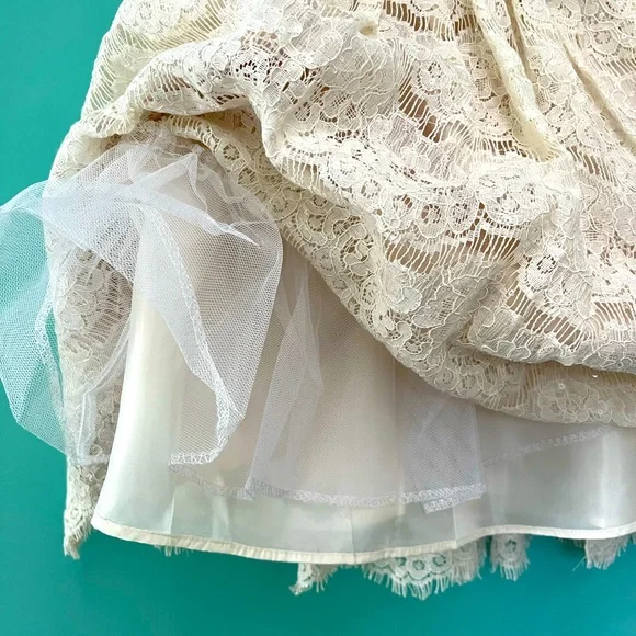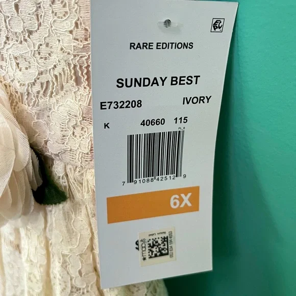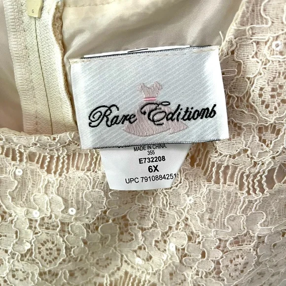 Perfect dress for Easter, a flower girl, first communion or other formal occasion. New with tags Ivory lace with some clear sequins throughout make this dress shine. It’s triple lined, with small petticoat along the bottom hem. Flutter sleeves, satin ribbon that ties in back.Back zipper and a beautiful flower accent on the front.Bought to wear as a flower girl in a wedding but never wore because bride changed her mind to something else. Simply gorgeous dress for any little girl. Size 6x, by Rare Editions, Sunday Best, purchased at Macy’s.