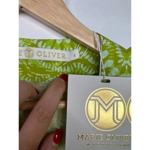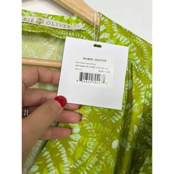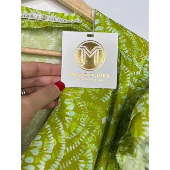 Marie Oliver V-Neck Tie Waist Tiered Fiona Dress Lime Burst Green. New with tag! Size: SmallFabric: 100% CottonUnlinedFiona is an evolution of our Emery silhouette, and a feminine choice for everyday. The super flattering, over-the-head v-neck style has an elastic waistband for shape and comfort. Thel belt covers, and cinches the waistline for a streamlined fit. Dimension is added by asymmetric tiers on the skirt, which are playfully rendered in neon-hued Lime Burst. dress, mini, minidress, romantic, sweet, girly, designer, premium, fall, winter, spring, summer, lunchdate, brunch, firstdate, nightout, datenight, vacation , resort, resortwear, party, multicolor, green, chic, classy, sophisicatedMarie Oliver V-Neck Tie Waist Tiered Fiona Dress Lime Burst Green