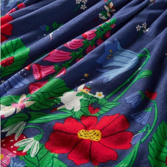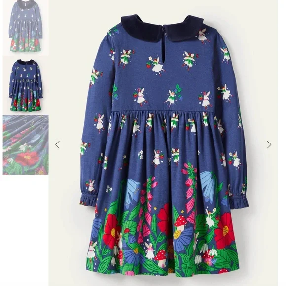 "Ready to twirl? This swing dress certainly is. It's got long sleeves for extra cosiness, a flippy skirt and a soft velvet collar. There are two options to choose from – one with a print of dancers at a magical ball and the other featuring fairies." Bodice lining 100% cottonMachine washableStock photos from Boden USA website.