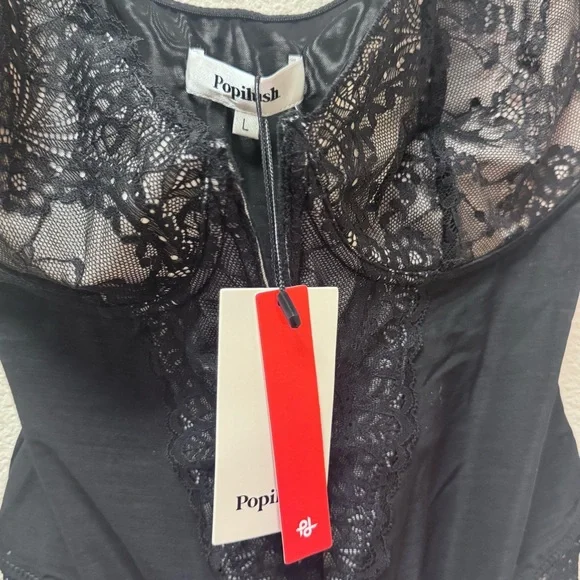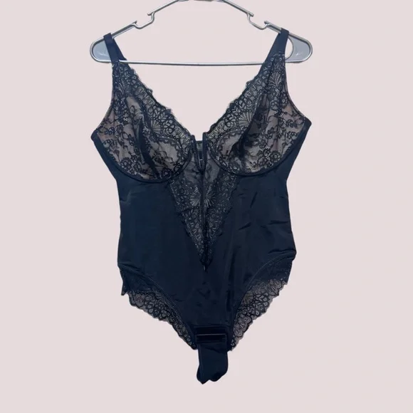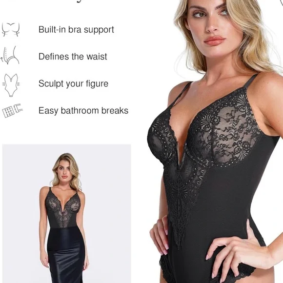 NWT Popilush Lace Corset V-Neck Thong Bodysuit - LgThis lace bodysuit combines style, shaping, and comfort. It features a pantyless design, butt-lifting effect, and bust support. The double-layer tummy control mesh provides a flattering fit. If between sizes, choose the larger size for the better fit