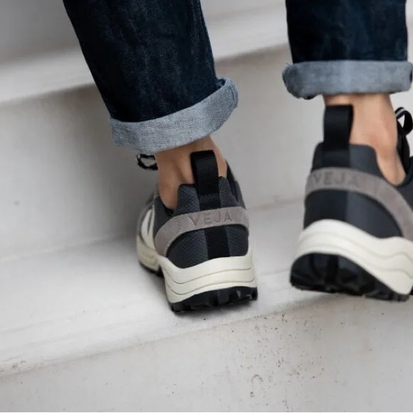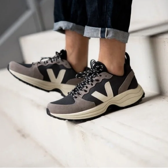 The Veja Venturi sneaker is a retro-inspired running design highlighted by the brand's recycled-polyester Alveomesh material on the uppers. Suede overlays add durability while sustainable materials compose the rest of the shoe. Alveomesh uppers. Suede, V-Knit and T.P.U. detailing. Rubber and rice waste logo. (22%)Sugar cane (52%) and recycled plastic bottles (23%) insole. Sugar cane (54%) midsole. Amazonian rubber (24%) and rice waste (29%) outsole. L-Foam (30% natural latex from Brazil) cushioning. Organic cotton (100%) laces. Fits true to size. Listed in EU Men's. Color: Graphite | Moonrock.