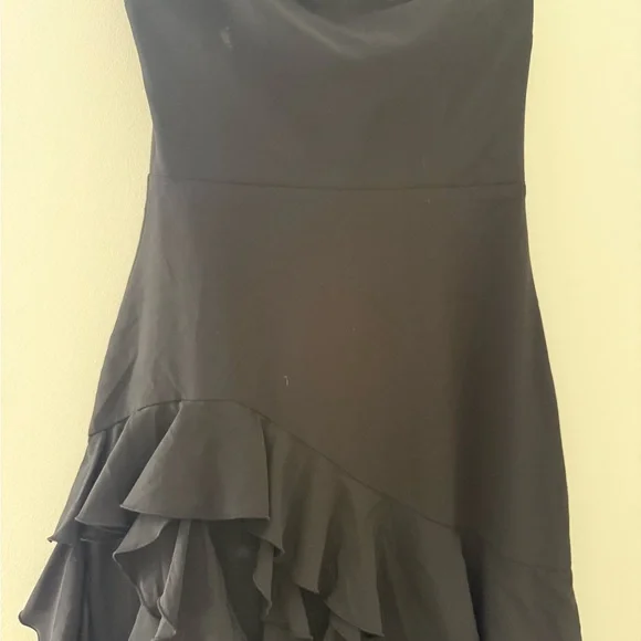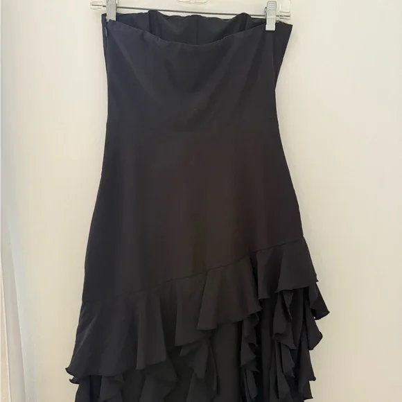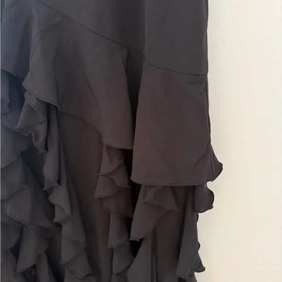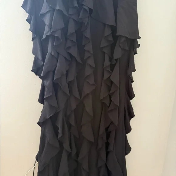 Elevate your evening look with this elegant black maxi skirt from Oh Polly, designed with a sophisticated trumpet silhouette and a chic high-low ruffled hem. Perfect for cocktail parties or a night out, this skirt offers a graceful flow and timeless style.Brand new. Never worn. UK size 6. US size 2.