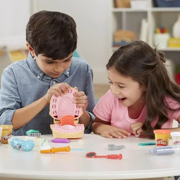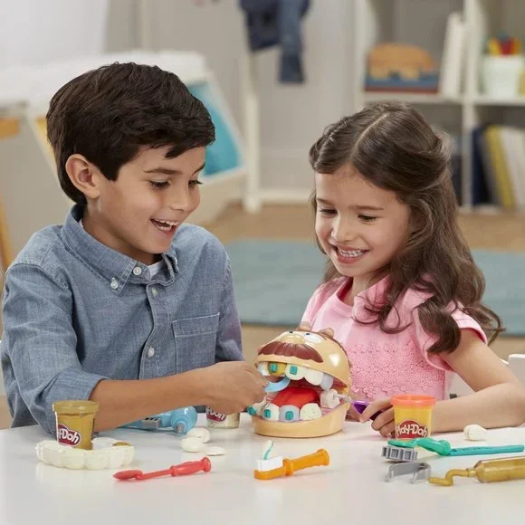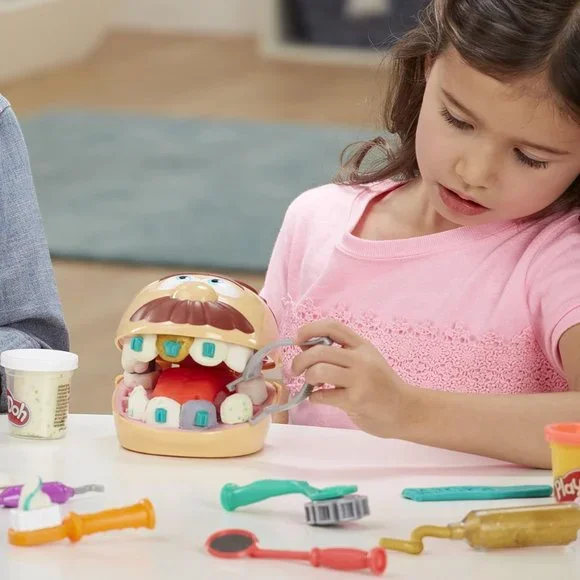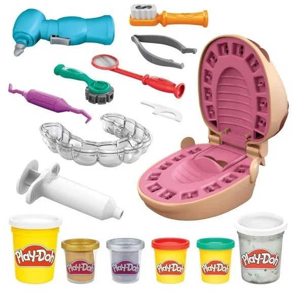 Brand New in Unopened Box☀️Open Wide: Kids can make the patient stick out their Play-Doh tongue and use the tooth mold to create an entire row of teeth at once.☀️Drill & Fill: Use the hand-powered spinning toy drill to tackle cavities, then squeeze Play-Doh fillings from the syringe extruder to fix them up.☀️Metallic Braces & Fillings: Add a touch of realism with silver and gold Play-Doh for pretend braces and cavity fillings using the roller and syringe extruder.☀️Complete Set: With 8 total cans, including special cavity and metallic colors, plus essential tools like a toothbrush, flosser, mirror, and tweezers, the fun is endless.☀️Brush & Floss: Don't forget oral hygiene! Our kit includes a toothbrush that squeezes Play-Doh toothpaste.