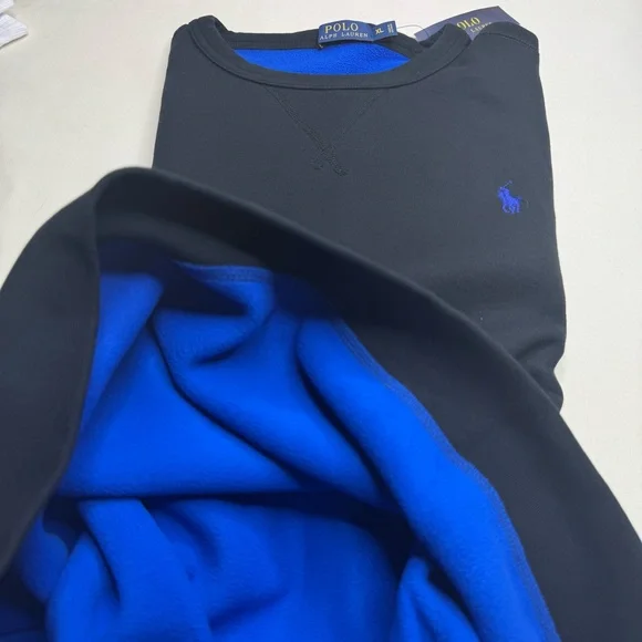 New! Never worn! Brought in 2018Men’s Polo Ralph Lauren sweatshirt, size XL. Based on standard sizing, an XL in Ralph Lauren typically fits a chest size of 42-44 inches (106-111 cm).The sweatshirt is black on the outside with a bright blue fleece lining. It features the Polo Ralph Lauren logo, a small blue polo player on the upper right chest. Size XL