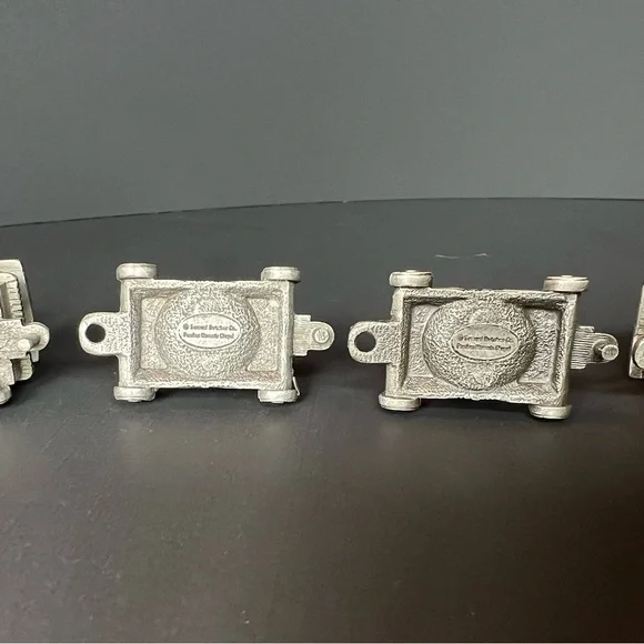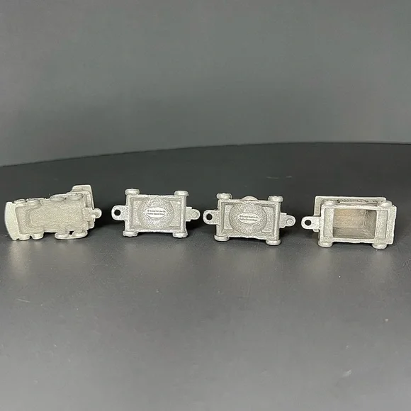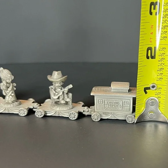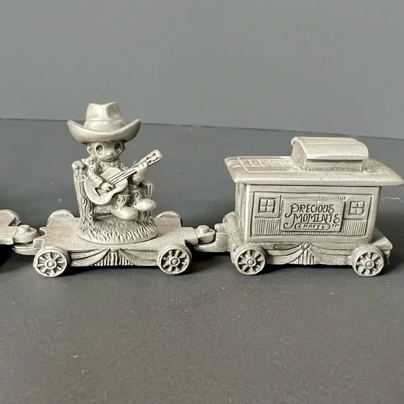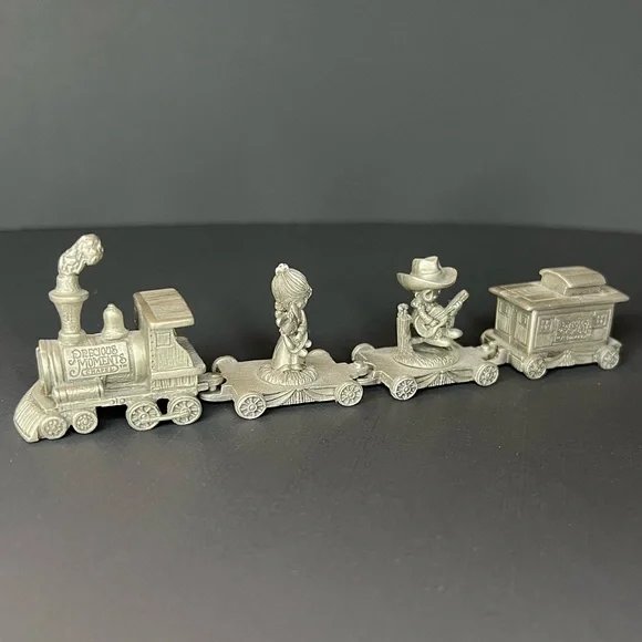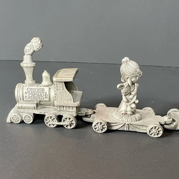 Precious MomentsChapel Train Set of 4Vintage- 1970sPEWTER-RareMini figurines join together to form train:1. Train Car2. “Jesus Loves Me” Girl3. “Hallelujah Country” 4. CabooseNO BOXNo damages/defects seen. In excellent condition. Comes from a Smoke Free Home**All Precious Moments on my page have come directly from my family. They have been kept in a display cabinet and have rarely been touched. No boxes were kept. If any imperfections or damages have occurred, picture and the description will explain.**Please let me know if you have any other questions/comments before ordering!