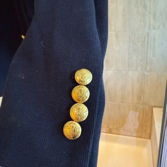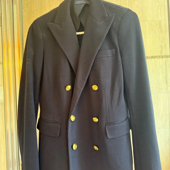 Experience timeless elegance with this Ralph Lauren pea coat, crafted in a rich blue hue with gold accents. The coat's structured design and premium fabric ensure both style and comfort, making it a perfect addition to any wardrobe. My