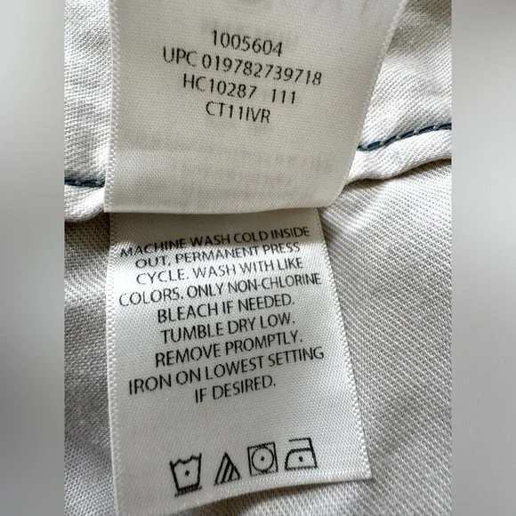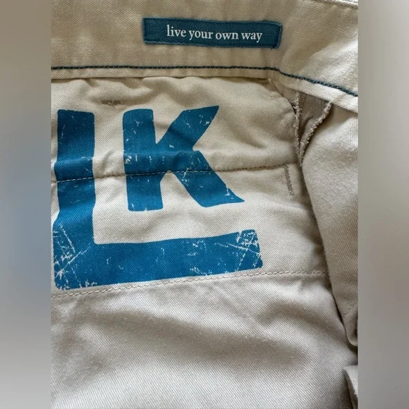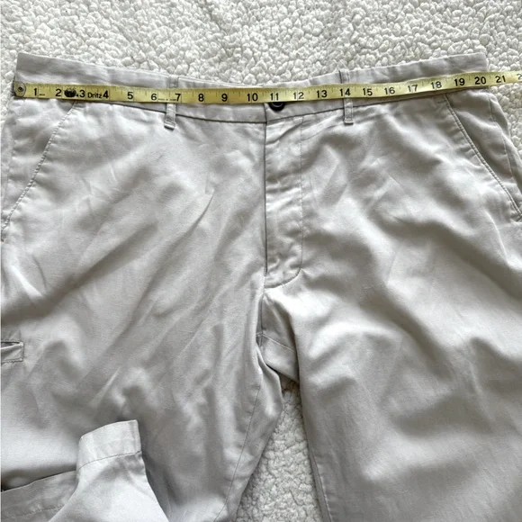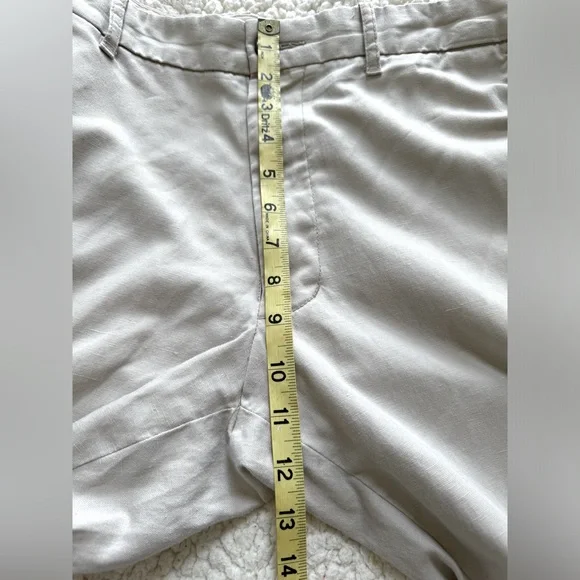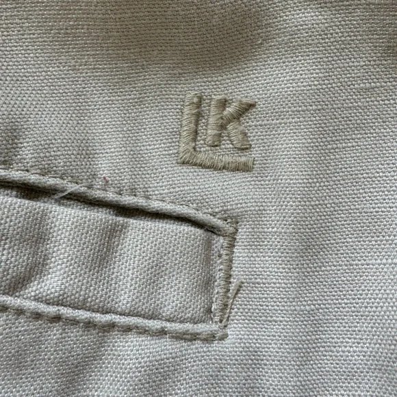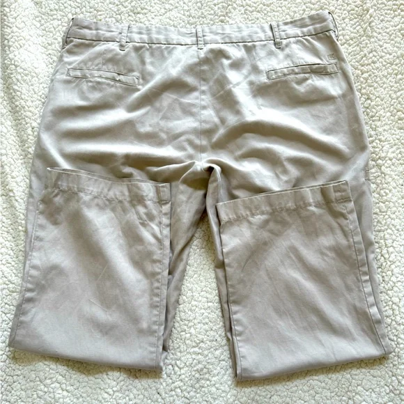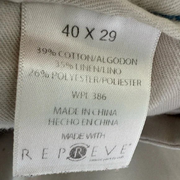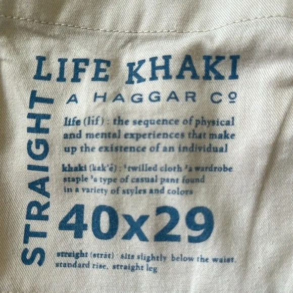 Rare 35% Linen, 39% Cotton, 26% Repreve Polyester Straight Leg Life Khaki by Haggar. Features a small thigh pocket, slightly below the waist comfort fit, and standard rise. Excellent used condition. No rips, stains, or tears noted.Measurements are approximate while lying flat in photos. Label care and fabric in photos. 40x29