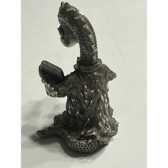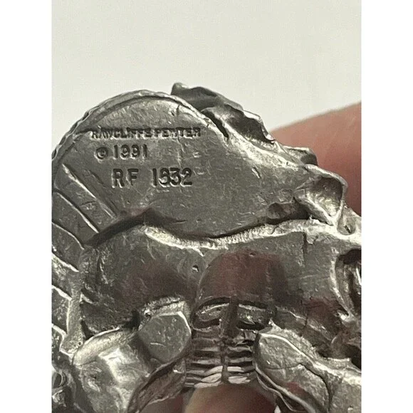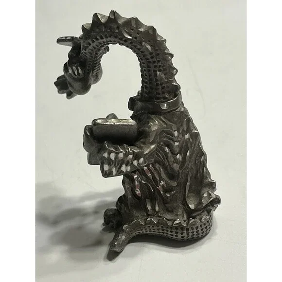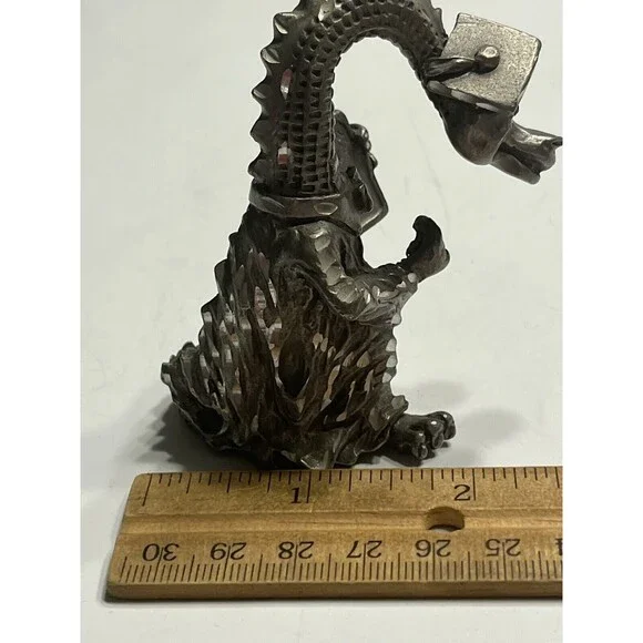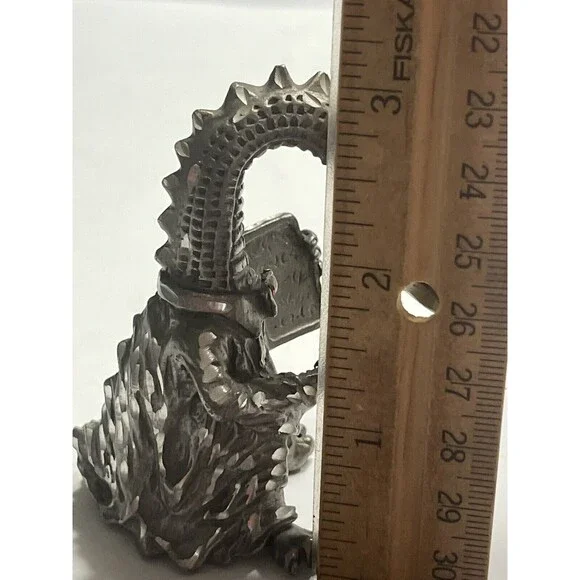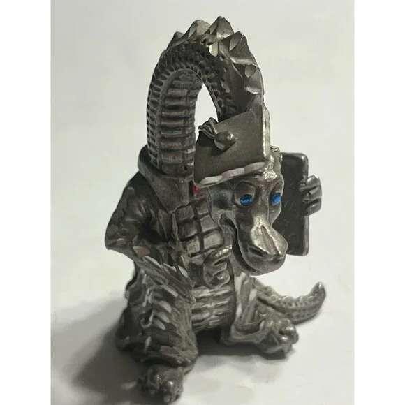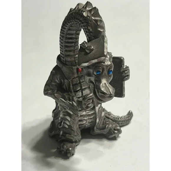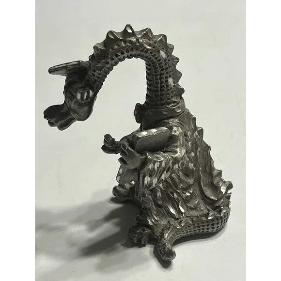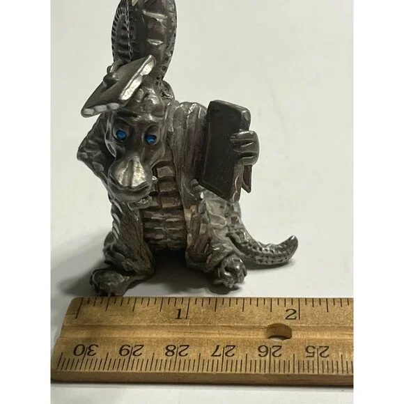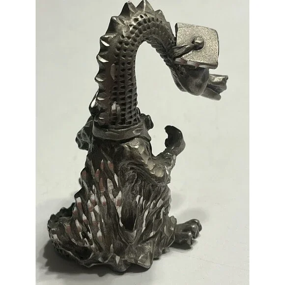 This rare and unique Rawcliffe pewter dragon figurine is a must-have for any fantasy and mythical collector. With its stunning blue eyes and intricate detailing, this handmade piece is sure to impress. The dragon is retired and hard to find, making it a rare find for any collector.The dragon is categorized under Collectibles, Fantasy, Mythical & Magic, and Dragons, specifically under Statues and Pewter. Its theme is Dragon and genre is Fantasy. This item is perfect for those who are looking for a rare and exquisite piece to add to their collection.