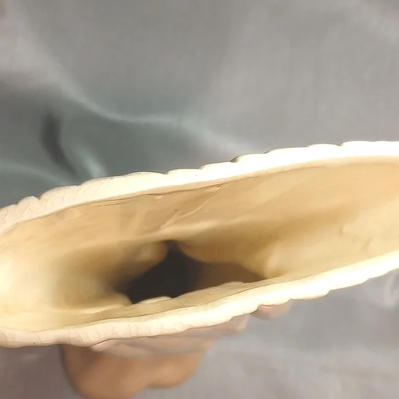 Rare, signed example of the work of hand sculptor Ray Shaw. Admitting she was obsessed with hands, Shaw devoted herself almost exclusively to them. Working primarily in the 1930s & 1940s, some of her notable subjects were Albert Einstein, Franklin D. Roosevelt, Helen Hayes and Lauren Bacall.The vase is 10" tall, 5.5" across the top and 4.5" across the bottom. It has consistent, uniform crazing in all areas. I've read this is not an unusual finish for her pieces, but have no authoritative info on that. There is discoloration around the base and near the inside base of the hand.