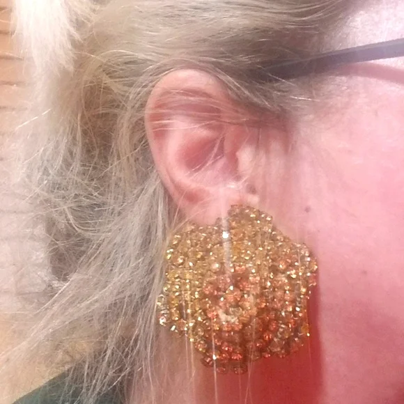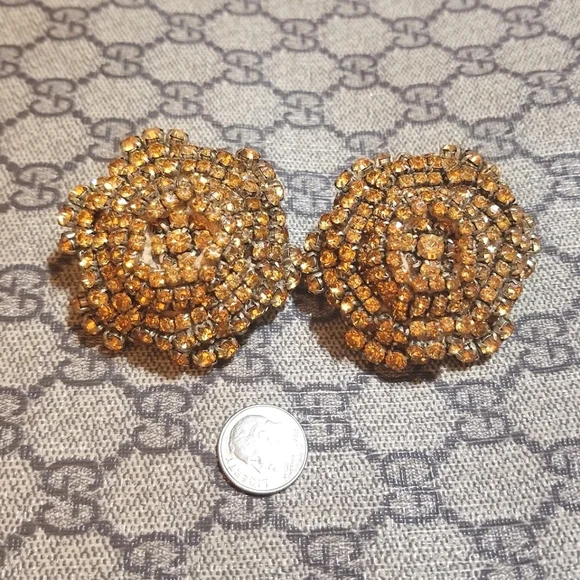 Exquisite Rebecca de Ravenel "Ava" Golden Topaz Crystal Runway Size Statement Earrings. These measure a Large 2" across and are Clip on Earrings. Rebecca de Ravenel spent her childhood between the Bahamas and Paris, both of which formed her innate aesthetic which remains deeply rooted in the old sensibilities of the tropics, with a touch of urban flair. For years she has worked in fashion and interior design, with a long standing desire of dressing the divine woman in the divine room. These beauties are in Excellent Pre-owned condition. A lovely addition to the Unique and Beautiful Designer Jewelry Wardrobe. Item E16.I've been in Vintage/Antique jewelry for over 35yrs and I sell some new items occasionally. Feel free to ask questions.MY LISTINGS GENERALLY CONSIST OF MANY ONE OF A KIND OR VERY RARE PIECES, SOLID 14KT ITEMS, PLATINUM, 18KT, DIAMONDS, AMETHYSTS, TOPAZ, AGATE, EMERALDS, SAPPHIRES, OPALS, STERLING SILVER, VINTAGE AND ANTIQUE PIECES, BOLD AND RUNWAY-ERA. DESIGNERS SUCH AS GIVENCHY PARIS NEW YORK, CHRISTIAN DIOR FRANCE, FENDI ITALY, VALENTINO, KENNETH JAY LANE, CHANEL, ALEXIS BITTAR, YVES SAINT LAURENT, HENRI BENDEL, HERMES, JUDITH JACK, KATE SPADE, MICHAEL KORS, MIRIAM HASKELL, CORO, PRADA, GUCCI.