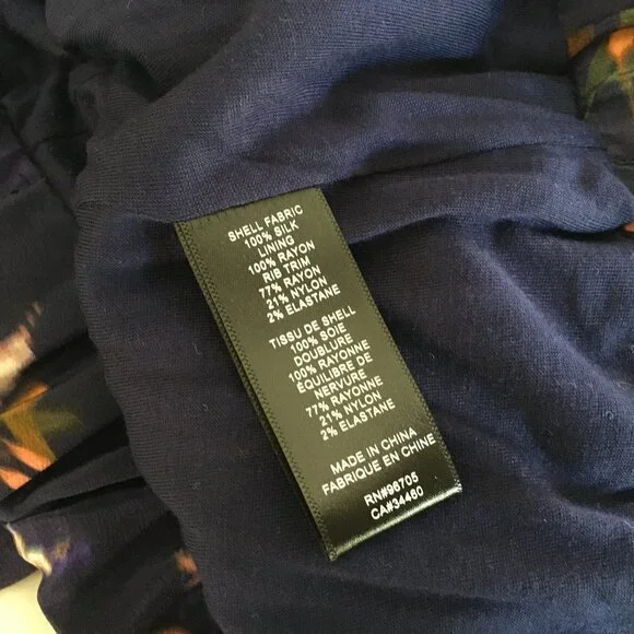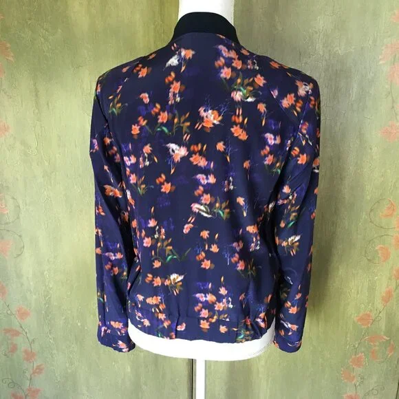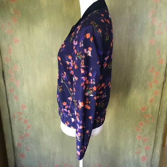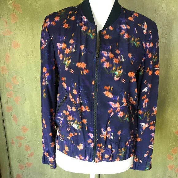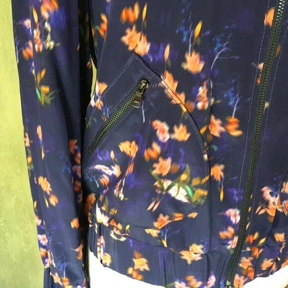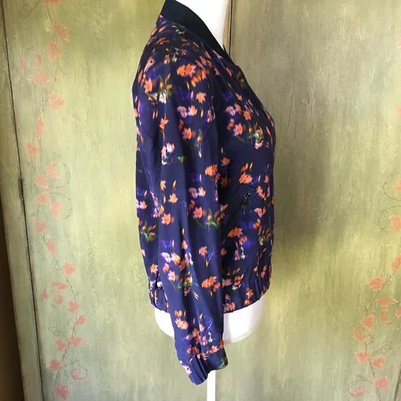 This jacket from Rebecca Taylor has a zipper front and two zipper slash front pockets.It has elastic cuffs.It is silk in a navy color with a pink and coral flower pattern.The elastic waist sits at the hip.It is a size 4 with these approximate measurements:Bust:36"Shoulder to shoulder:15 1/2"Sleeve length:23"Waist:36"Hips:38"Nape of neck to hem:22"