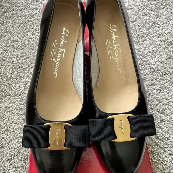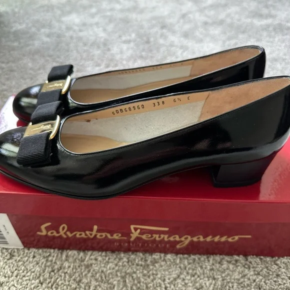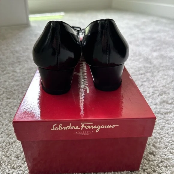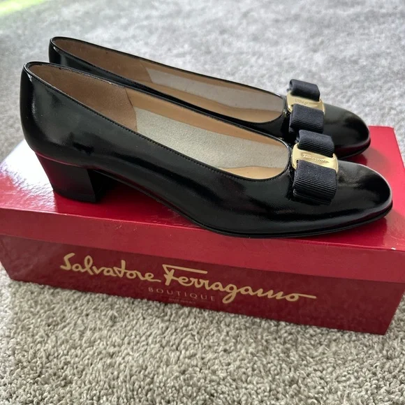 These Salvatore Ferragamo heels showcase a timeless black design with a rounded toe and a sophisticated bow detail. Crafted for both style and comfort, they are ideal for everyday elegance. These are boutique vintage shoes in excellent condition. A comfortable, neutral, and stylish staple for your wardrobe.