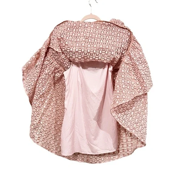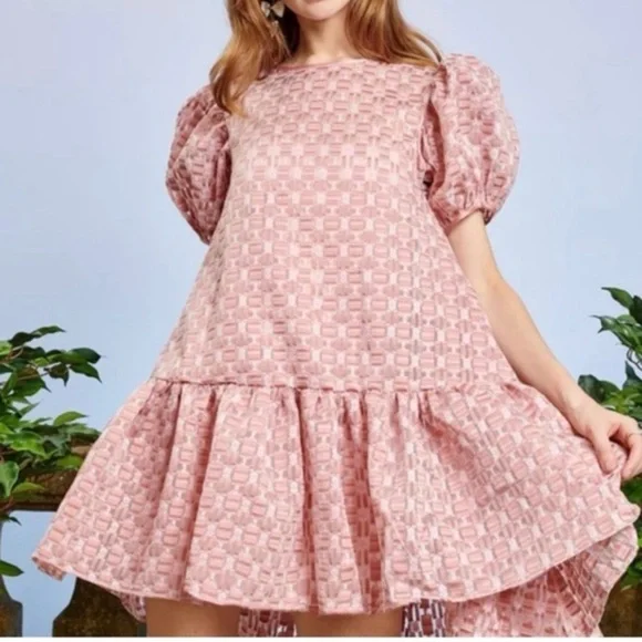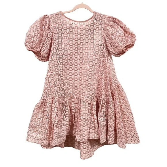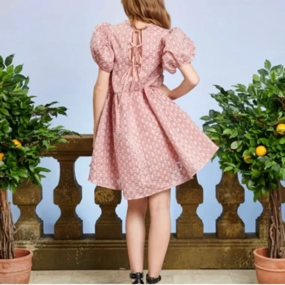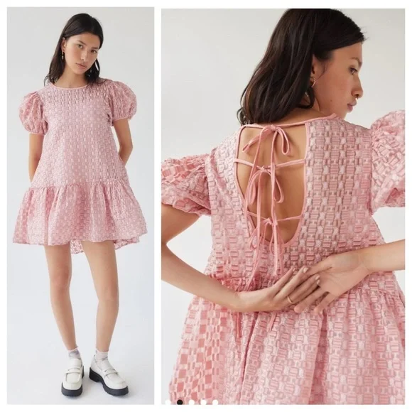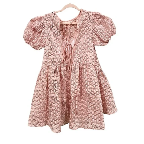 Sister Jane mini dress crafted from a textured material. Easy fit throughout with a crew neckline, puffy short sleeves and a tiered mini skirt. Finished with a cutout and adjustable ties at the back. Removable lining included. New with tagsSize Small(approx, on hanger) pit-pit 17” length 32”Color: pinkTags: romantic, Valentine's Day, fairycore, balletcore, feminine, girlie, wedding guest, school, preppy