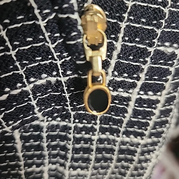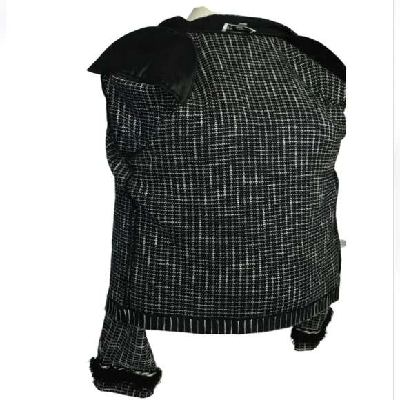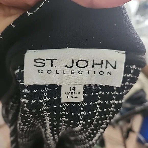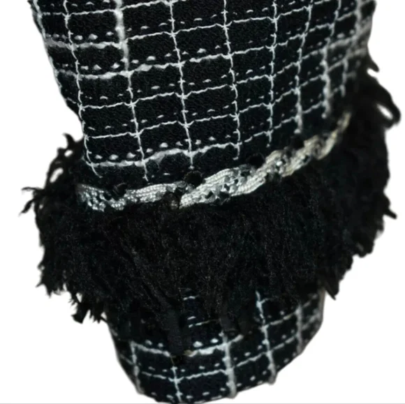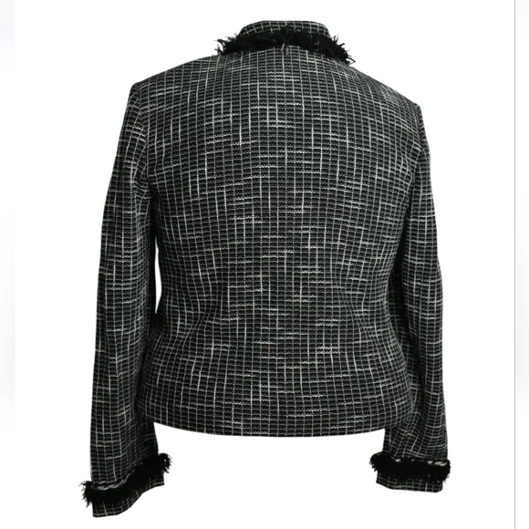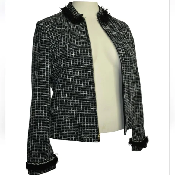 Elevate your wardrobe with this sophisticated St. John blazer, a perfect addition for any business or formal occasion. The black and white check pattern exudes elegance, while the knit wool blend material ensures warmth and comfort. The jacket features a full zip closure and stretch fabric for a flattering fit. The long sleeves and ventless design add a touch of class, making it an ideal choice for the fall, spring, and winter seasons.Crafted in the United States, this suit jacket/blazer is a one-piece wonder that doesn't compromise on style or functionality. The regular fit and size type make it a versatile option for women, while the brand's reputation ensures quality. With its fringe trim and formal theme, this St. John blazer is a statement piece that will elevate any outfit.PTP 22" UNSTRETCHEDLENGTH 24"
