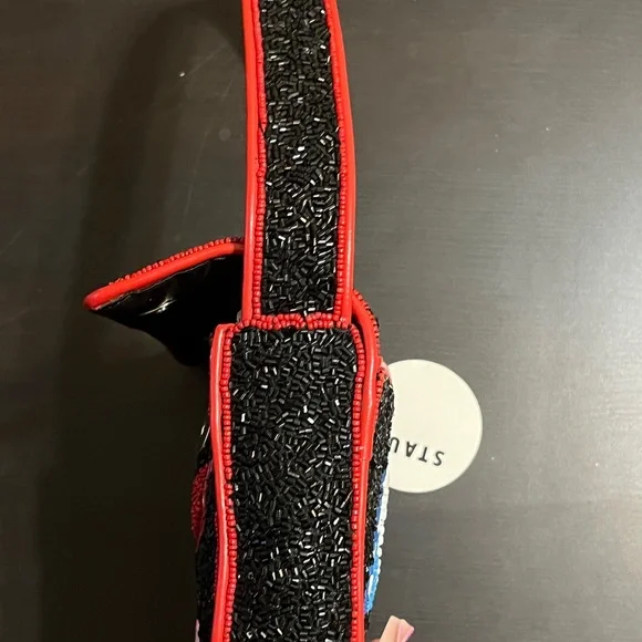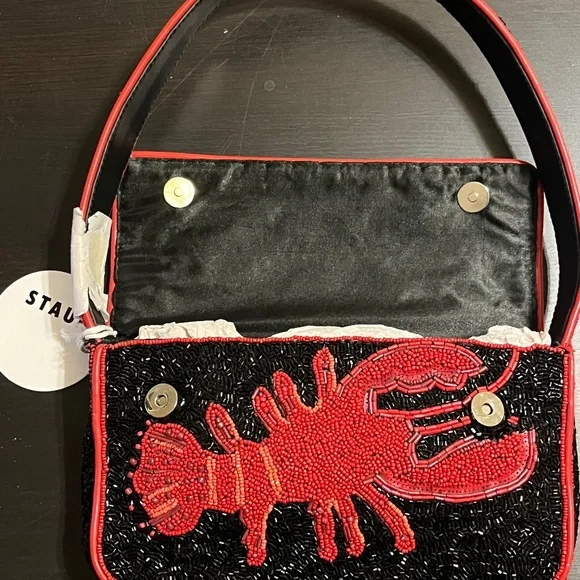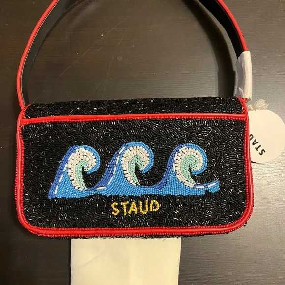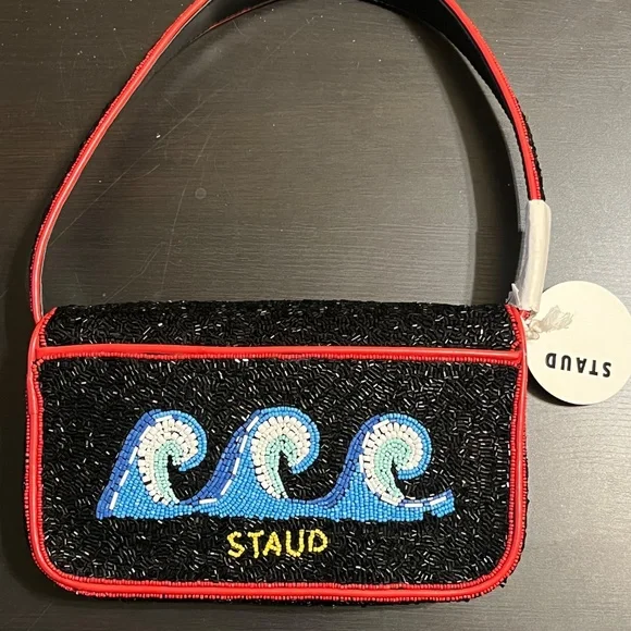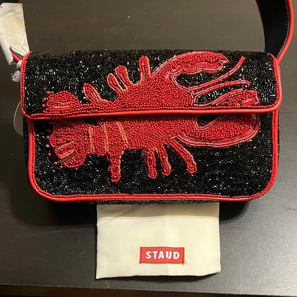 ✨NWT✨ DEAD STOCK!RARE DESIGNDetails - Fabric: Satin - Delicate glass hand beaded lobster & wave designs - Structured silhouette - Leather trim - Fold-over flap with magnetic snap - Zip interior pocket - Magnetic exterior pocket - Textile liningHeight: 6.25 in.Length: 9.75 in.Depth: 2 in.Strap drop: 7 in.Price is negotiable so feel free to make an offer. The package will include original packaging, the shoulder bag, and a STAUD dustbag. ⭐️ Also looking for the evil eye bag