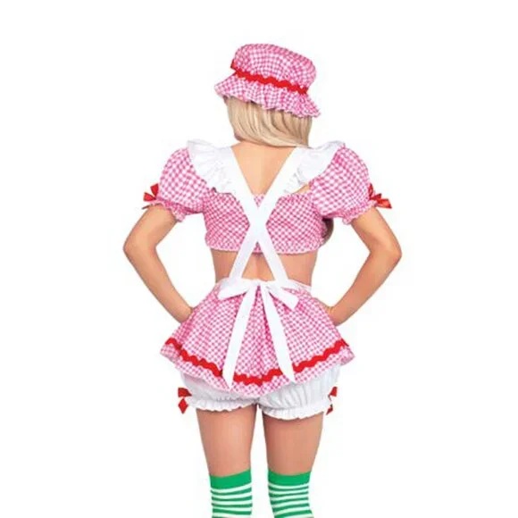 Three Pieces Berry Babe Costume Set Includes gingham crop top, suspender skirt with attached bloomers, and bonnet. This sexy costume for women is perfect for a Halloween costume, themed parties, or bedroom roleplay costume fun! Iconic color scheme and magical inspired details make this a must-have for any fan.