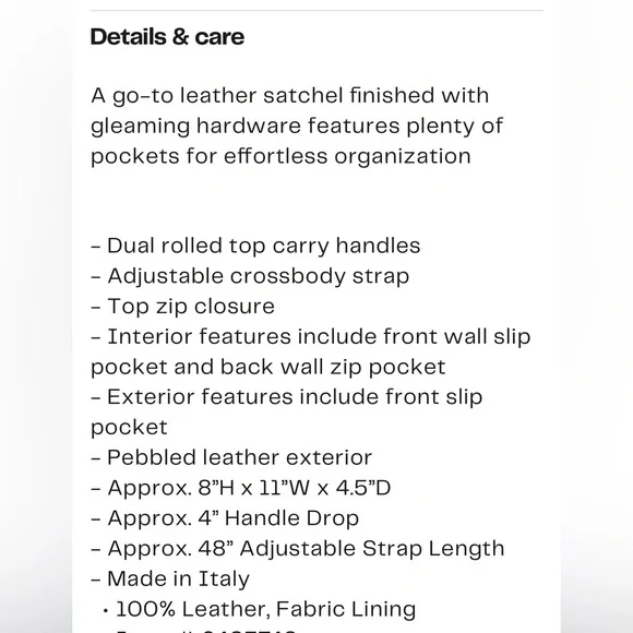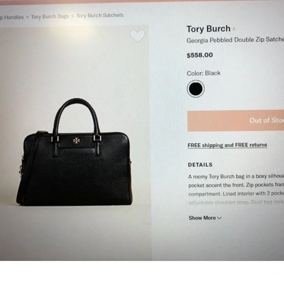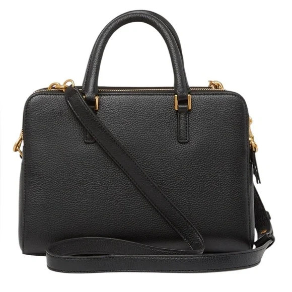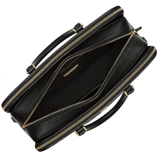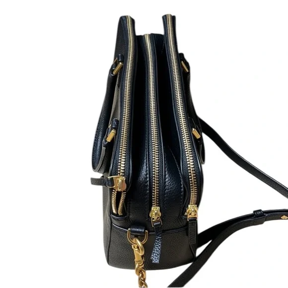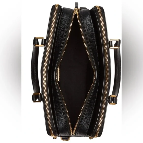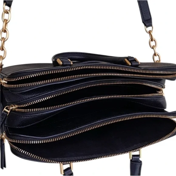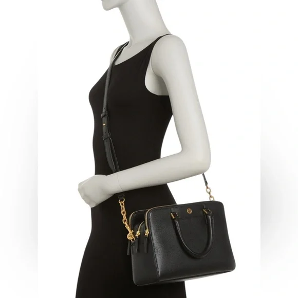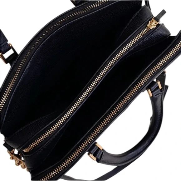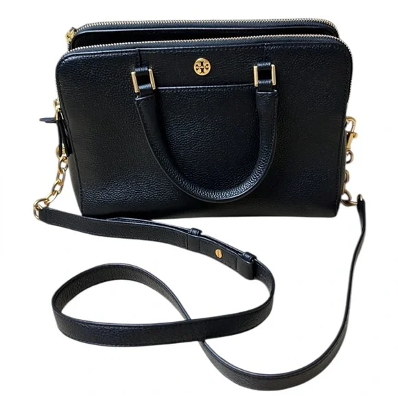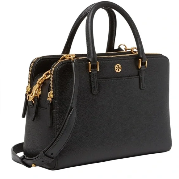 TORY BURCH Georgia Double Zip Pebbled Leather Satchel Black GoldOnly used a handful of times I would rate a 9 out of 10. *Comes with dust bagA go-to leather satchel finished with gleaming hardware features plenty of pockets for effortless organization- Dual rolled top carry handles- Adjustable crossbody strap- Top zip closure- Interior features include front wall slip pocket and back wall zip pocket- Exterior features include tront slip pocket- Pebbled leather exterior- Approx. 8"H x 11"W x 4.5"D- Approx. 4" Handle Drop- Approx. 48" Adjustable Strap Length- Made in Italy• 100% Leather, Fabric LiningQuestions? Leave a comment below!P-250