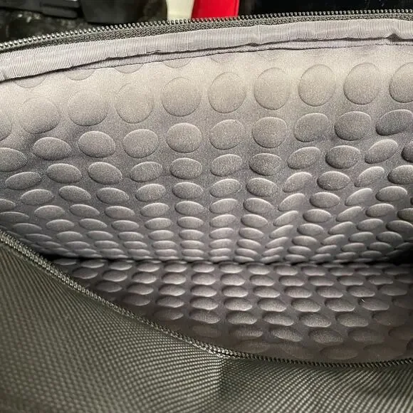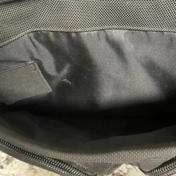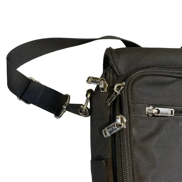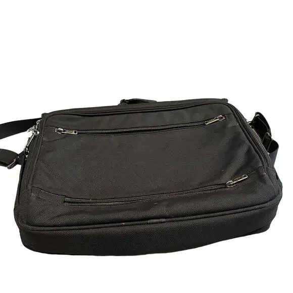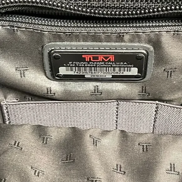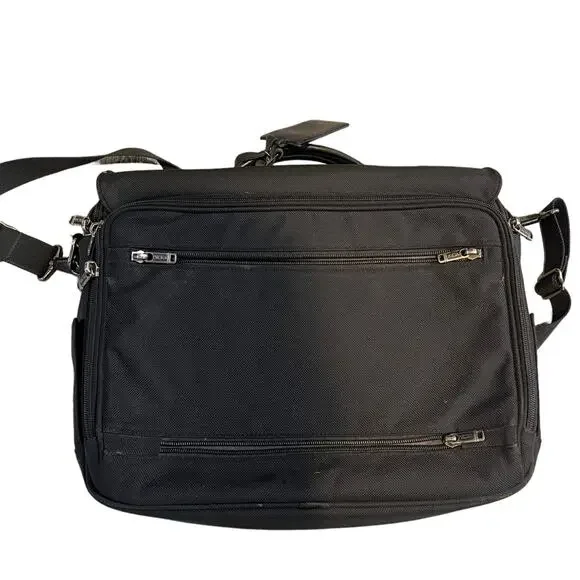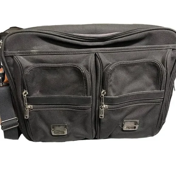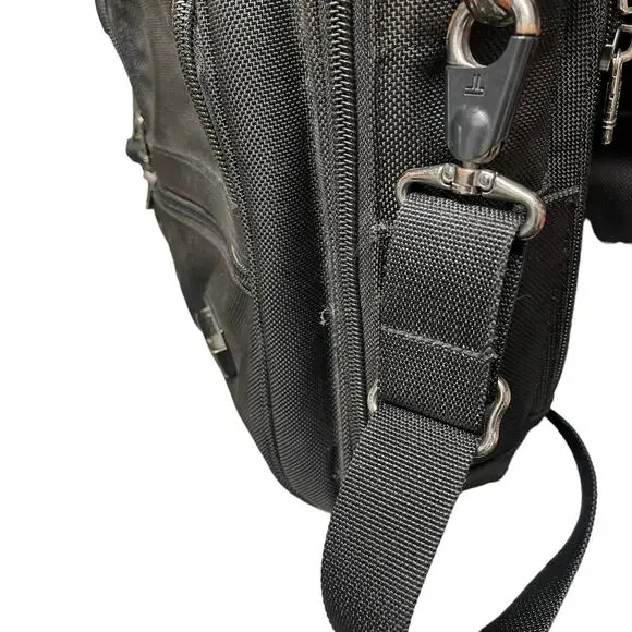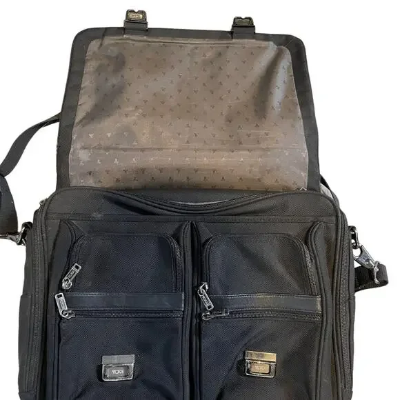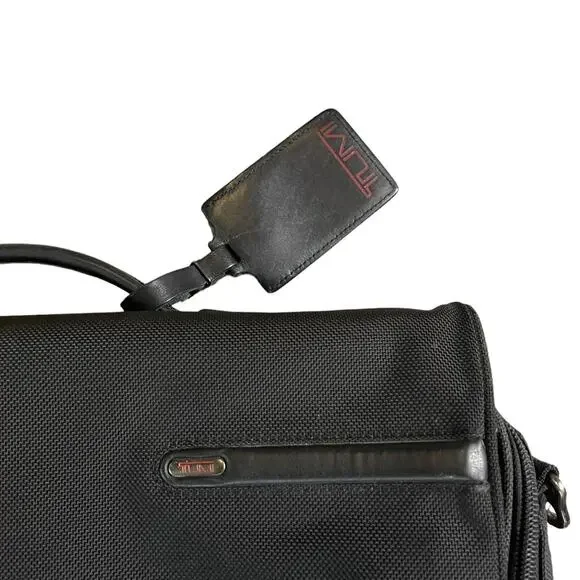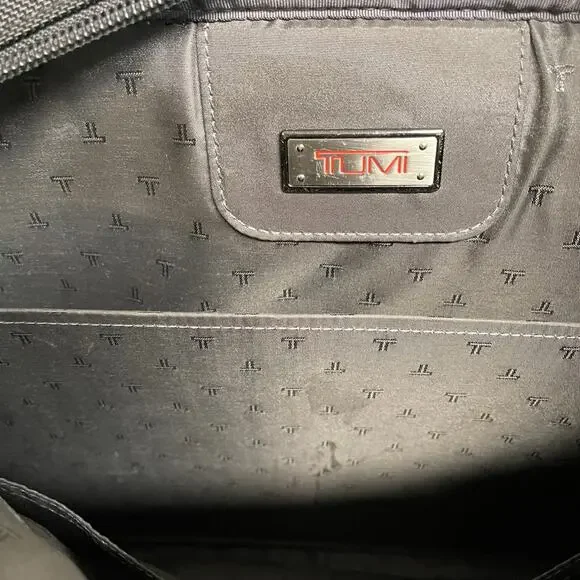 TUMI Leather Trimmed Canvas BriefcaseDescriptionTumi BriefcaseBlack CanvasGunmetal HardwareLeather TrimFlat HandleLeather Trim Embellishment & Single Exterior PocketLogo Jacquard Lining & Single Interior PocketPush-Lock Closure at FrontHandle Drop: 1.25"Height: 14.25"Width: 18.5"Depth: 4.75Details:minor discoloration throughout; minor blemish at exterior please check photos carefully