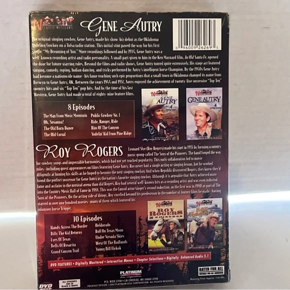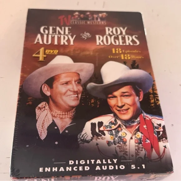 This product is a rare, factory sealed DVD collection of classic westerns featuring iconic actors Gene Autry and Roy Rogers. The DVD format allows viewers to enjoy these timeless TV shows and movies in the comfort of their own home. With a focus on the classical western genre, this collection offers fans of classic westerns a chance to revisit some of the most beloved tales from the past, featuring the talents of beloved actors such as Gene Autry and Roy Rogers.
