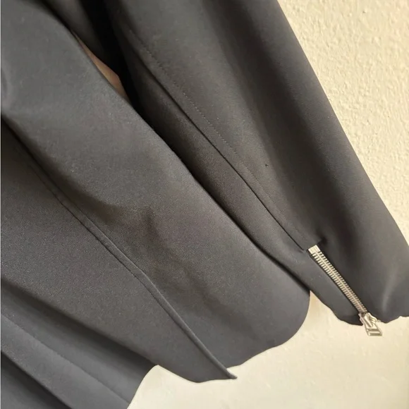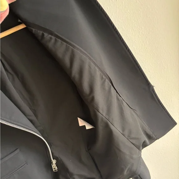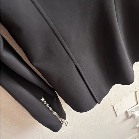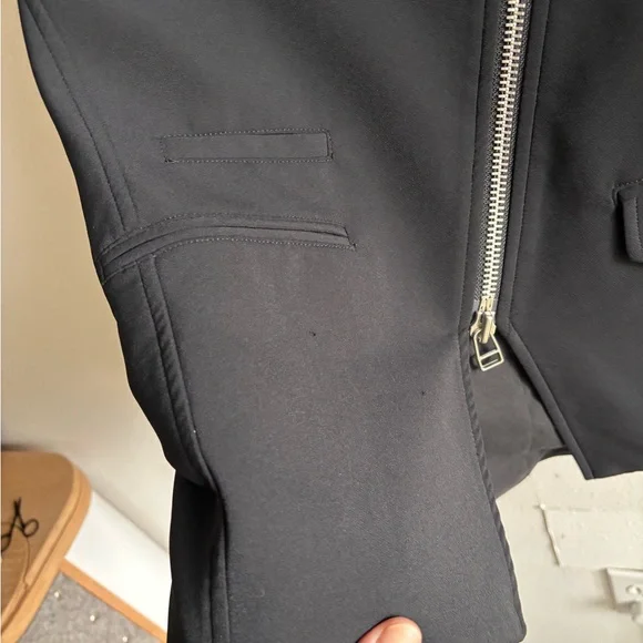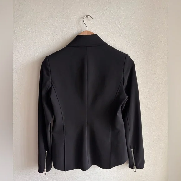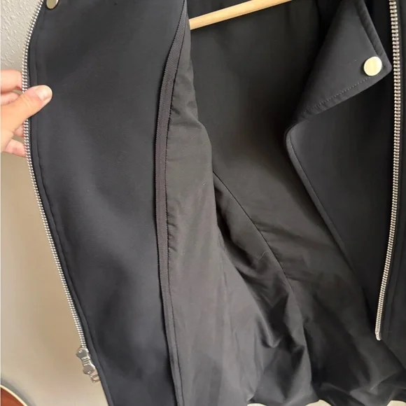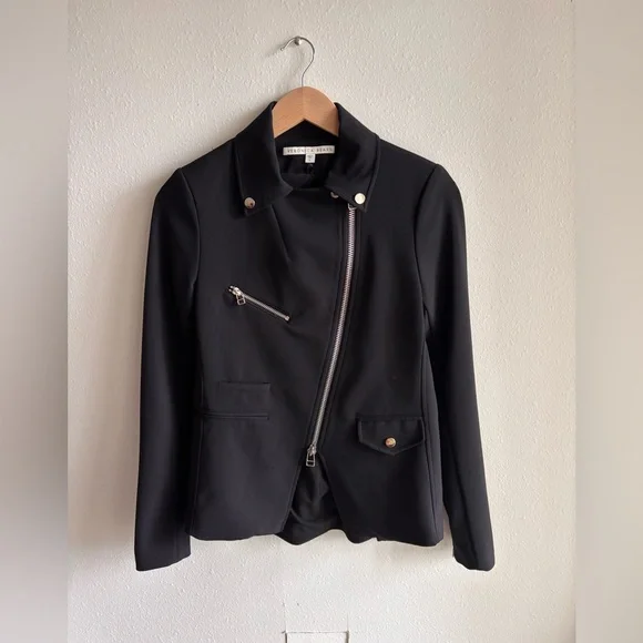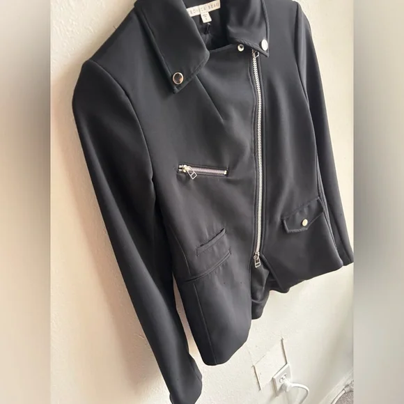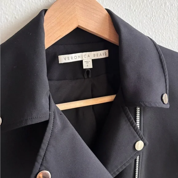 Gently used, a few small snags but excellent condition otherwise.Fabric: Mid-weight neopreneAsymmetrical design with collared neck and peaked lapelsSilver-tone hardwareLong sleeves with padded shoulders and zip cuffsZip welt and flap front pocketsCompatible with any Veronica Beard Dickey (sold separately)Waist-length styleShell: 86% nylon/14% elastaneLinedLining: 100% polyesterDry cleanMade in the USA of imported materialsStyle VBEAR31365This Veronica Beard jacket gives a sporty-chic update to a classic moto jacket with luxe neoprene.Pair it with one of the label's signature dickey hoodies for an edgy meets laid-back style that will take your off-duty look to the next level.