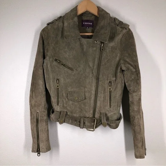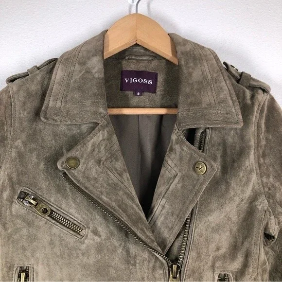 Vigoss Genuine Brown Suede Leather Moto Jacket, Some Light Marks From Normal Wear Otherwise In Great Preowned Condition. Size SmallMeasurements are by hand and approximate, clothing is measured while lying flat: Pit to pit:16”Shoulder to Hem:20”Style Profile: Punk, Biker, Moto, Grunge, Feminine, Sexy, Dark Romantic, Comfy, Cozy, Boho, Bohemian