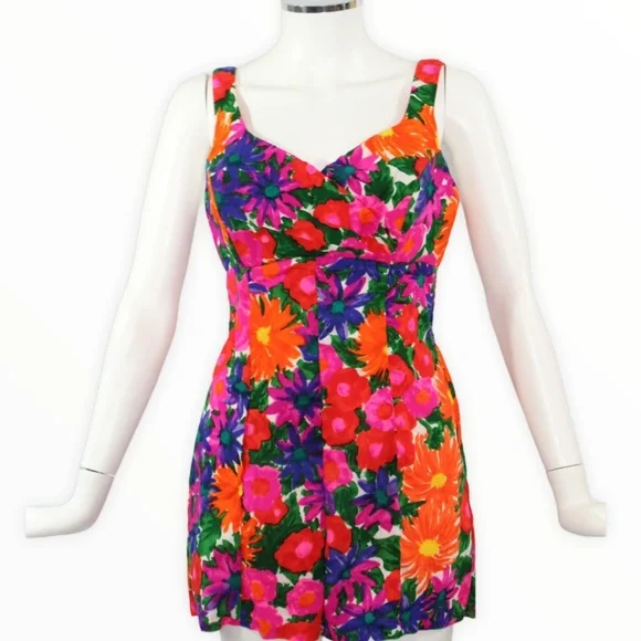 Perfect retro bathing suit from the 1960s, made by the long-time staple in swim: Jantzen. This suit is made in the cutest large-print floral fabric with fitted cups, full-lower lining, rear zipper, and adjustable shoulder straps. This ensemble is made for water but would be such a cute romper also. Just the greatest little retro piece!MEASUREMENTSChest: 18 inches flatWaist: 13.5 inches flatMax Length: 29 inchesCONDITION REPORTSwimsuit is in excellent condition, showing no noticeable flaws.