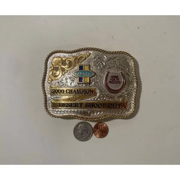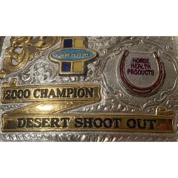 Vintage 2000 Metal Belt Buckle, Silver and Brass, 2000 Champion, Desert Shoot Out, Horse Health Products, FARNAM, Big Size, Nice Design, 4 1/2" x 3 1/2", Heavy Duty, Quality, Thick Metal, Made in USA, For Belts, Fashion, Shelf Display, Western Wear, Southwest, Country, Fun, Nice, Free Shipping in the U.S.