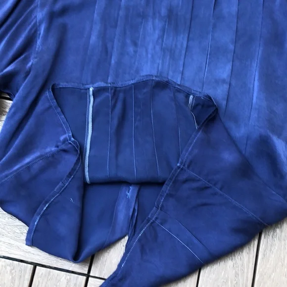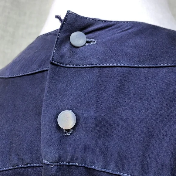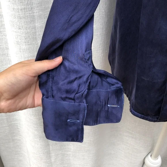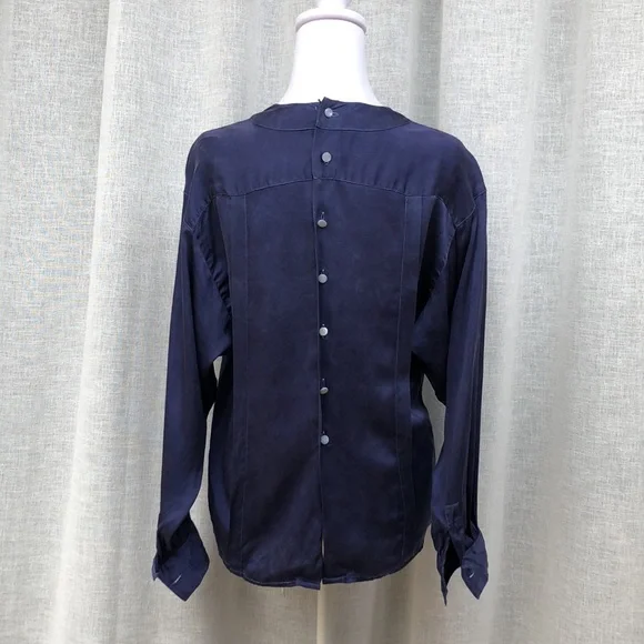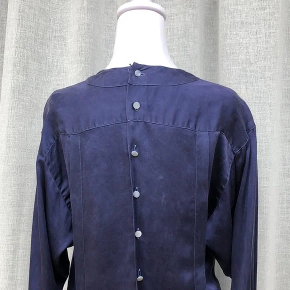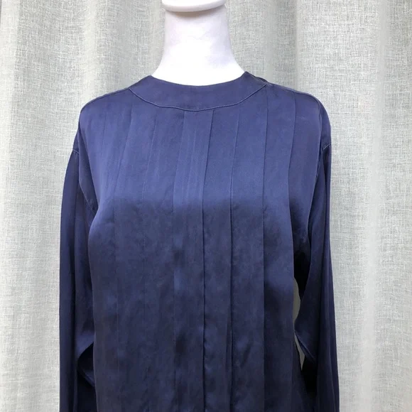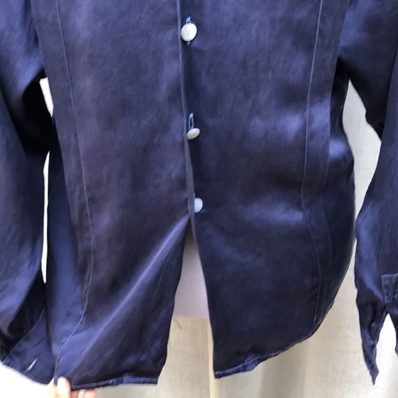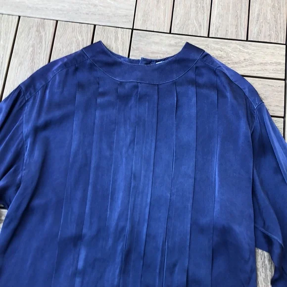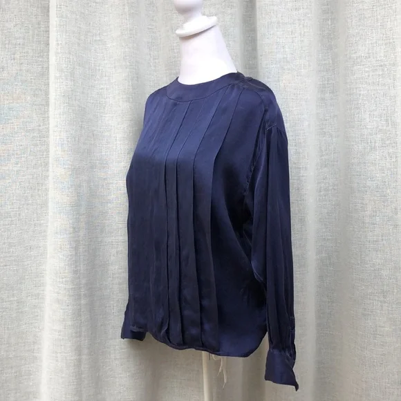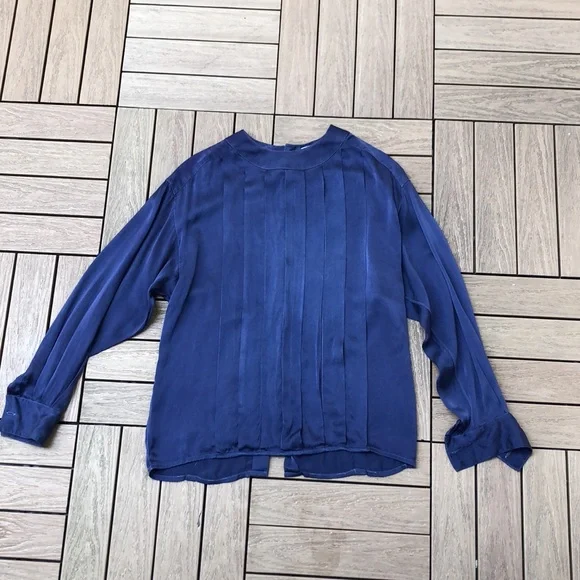 For sale is a beautiful vintage denim blue with front pleats blouse by CHANEL, button down in the back, long sleeves. No marked size, please see measurements for proper fit. Great vintage condition! The blouse was died. Buttons feature Chanel logo Measurements (flat):shoulder to shoulder: 18”armpit to armpit: 17” sleeve length: 20”overall length: 24”PB9