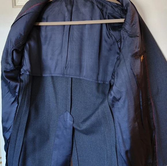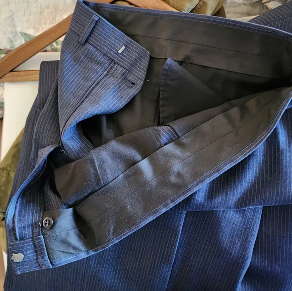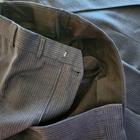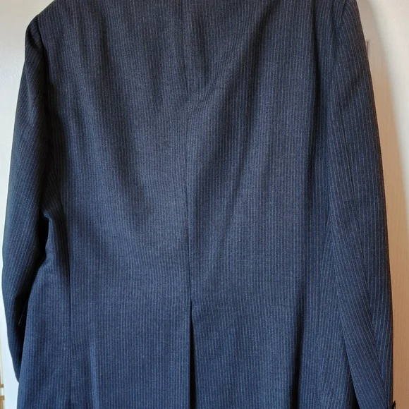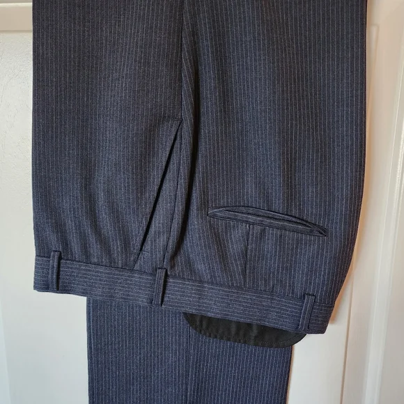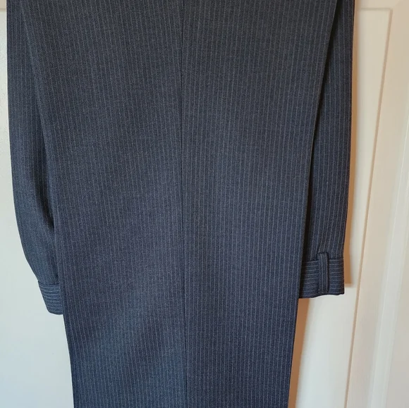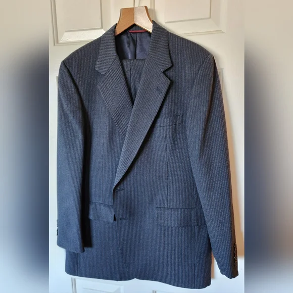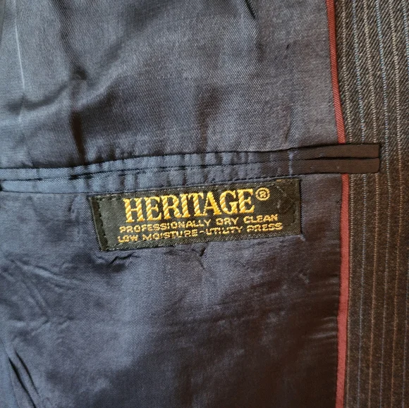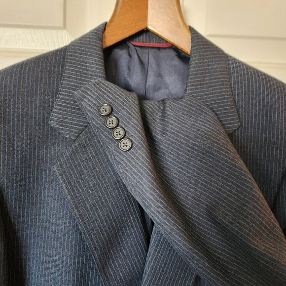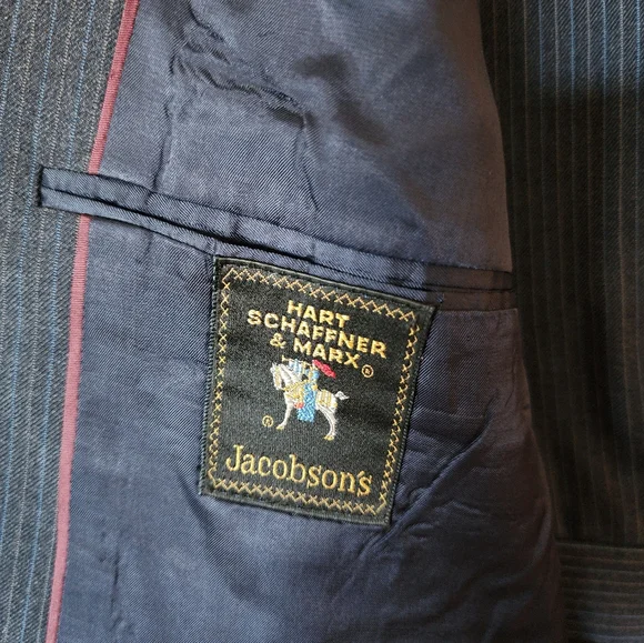 Vintage Hart Schaffner & Marx Blue Pinstripe Wool Suit from 80'sJacobson's Label Heritage Wool LabelSuit makes a statement - great condition for ageSize is 42RJacket -31 1/2" Length 17 1/2" Width ShoulderPants - 34 1/2 Waist (from clasp)27 1/2" Length InseamSee Pic of Cuffs for extra material to alter Length Please let me know if you need more measurements!No visible damage - no rips, tears or stains Suit was dry cleaned before storage - wrinkles from storage can be steamed out
