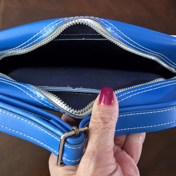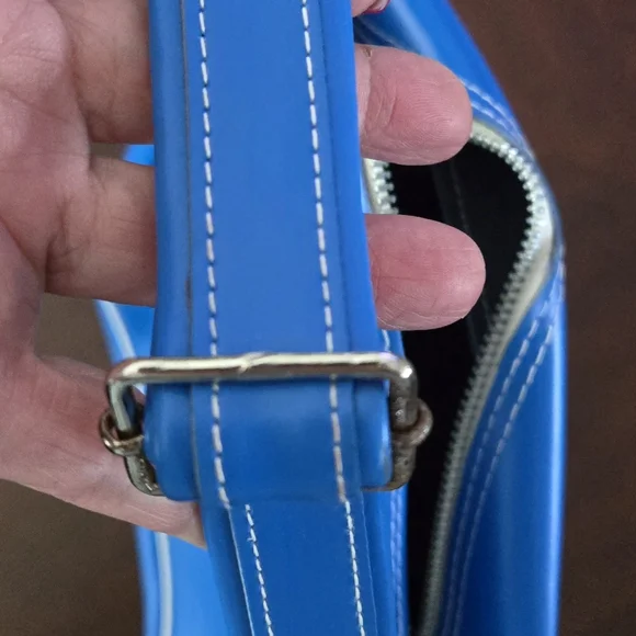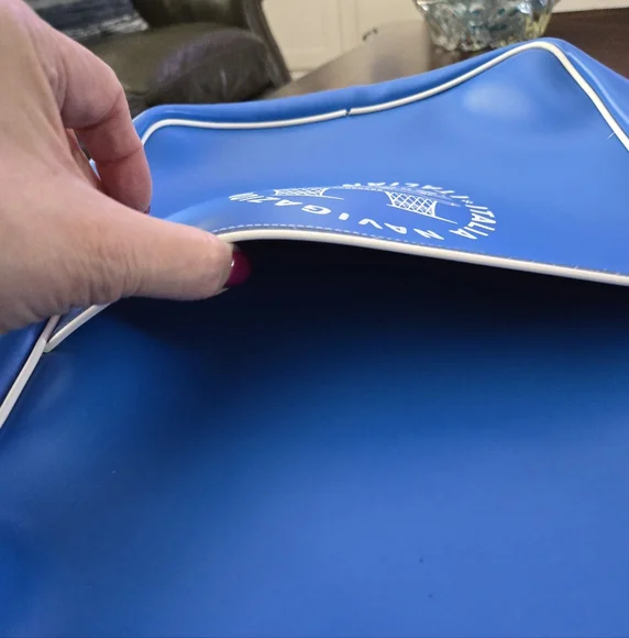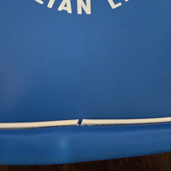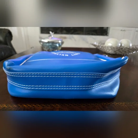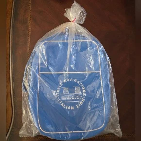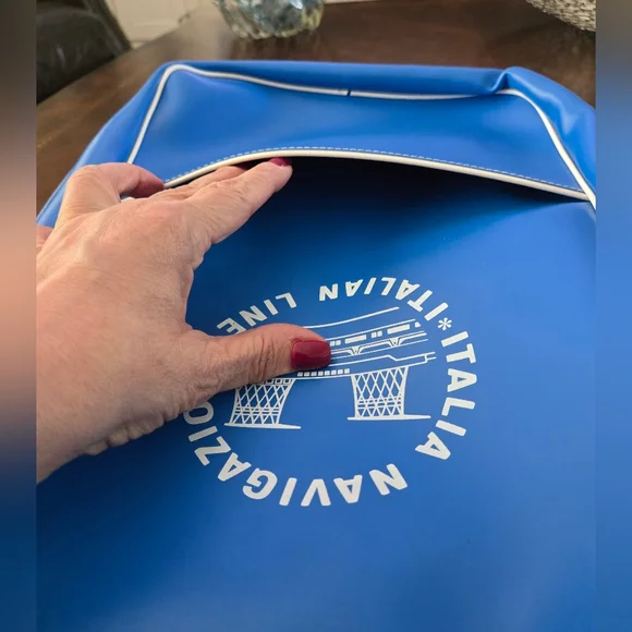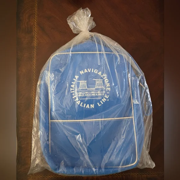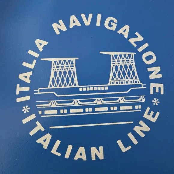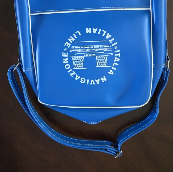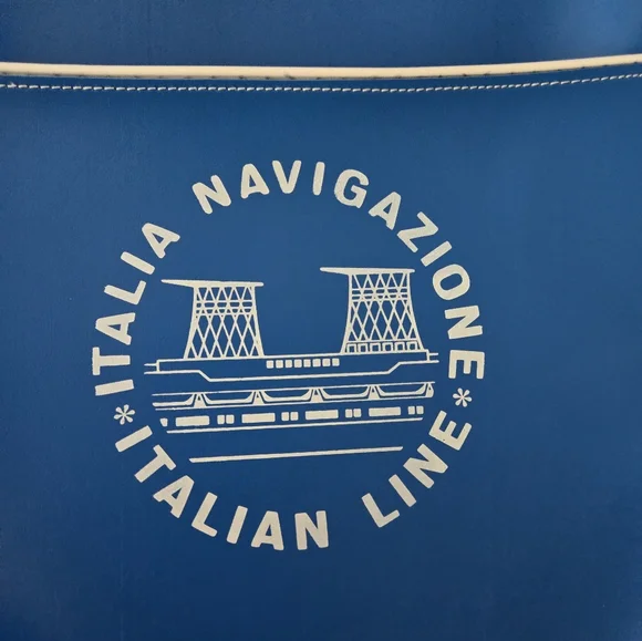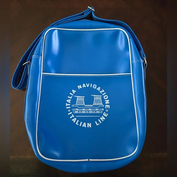 Hard to find, Vintage (1960s or older) Italian Line Travel Bag. Italia Navigazione.Graphics are the funnels from the SS Michelangelo and SS Raffaello Ocean Liners.Approximate measurements. Inside not filled to expand15" long12 1/2 wide4" deepDurable vinyl, adjustable strap. Open pocket on each side. New, never used, opened just for pics and to measure. White trim on each side split and little rust at buckle. (see photos)