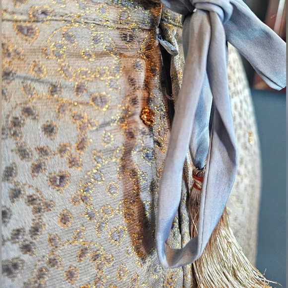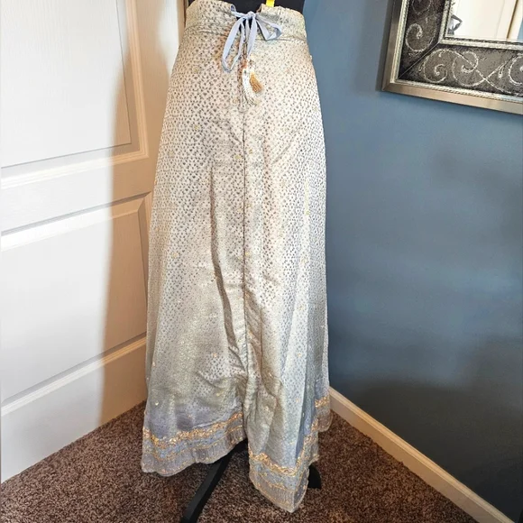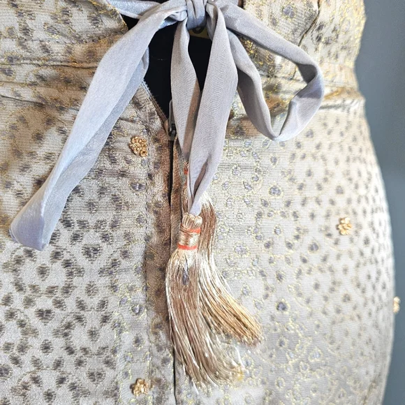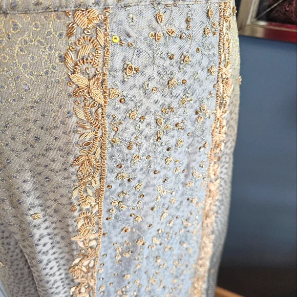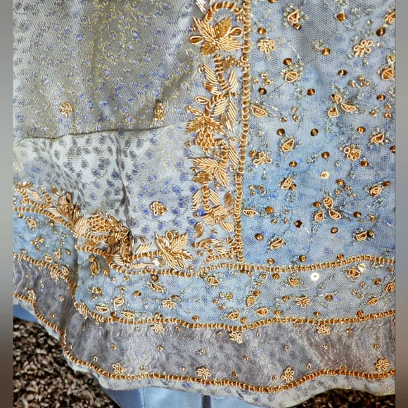 Used and LovedSmoke free and Pet Friendly Household Beautifully Eccentric Beaded LehengaYou won't come across 1 like this againA lehenga is a traditional Indian garment that is an ankle-length skirt that is paired with a matching blouse and scarf. Lehengas are often decorated with traditional embroidery, and gota patti embroidery is commonly used for weddings and festivals. Lehengas are a popular choice for weddings, festivals, and special events in India.Approx 20" waist line laid flatApprox 40" with tailor measuring tapeApprox 41 1/2" in length