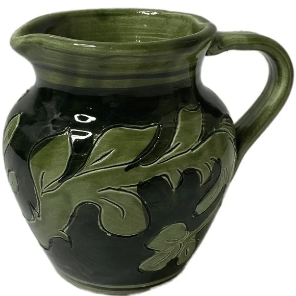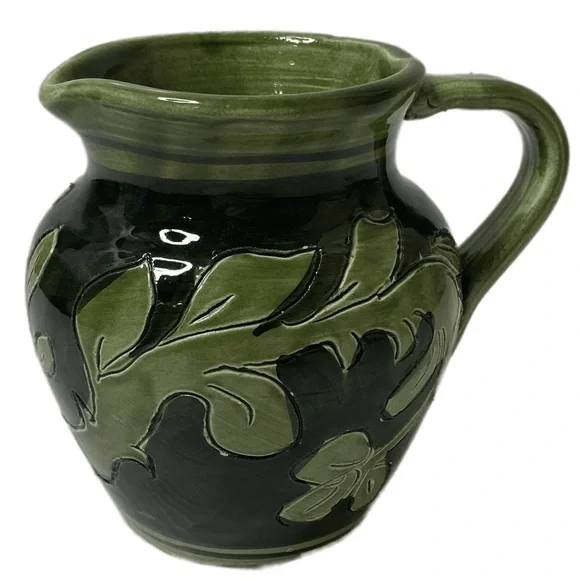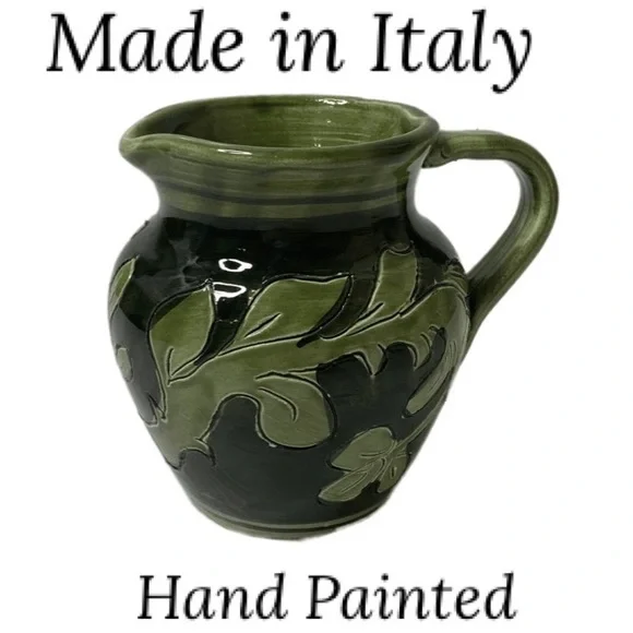 Italian Made Pottery Pouring Pitcher With SpoutHandcrafted Italian Pottery From 1960sApprox SizeHeight 5 1/2”Width With Handle 6”Mancer Maker Mark On BottomBeautiful Vintage ConditionLovely Leaf Pattern Design Beautifully Made AntiqueExquisite Vintage 60s Piece !Color GreenMade in ItalyHand Painted*All items are carefully wrapped and properly packaged to insure no damage while in transit 🚚📦Follow me for:Vintage AntiquesTuscan Mediterranean English Countryside Cottagecore MCM Mid Century Modern Farmhouse Boho Shabby Chic Cottage Core Grandmacore Retro Rustic Edwardian Bohemian Medieval Victorian Aztec Tribal African Nautical Coastal Handcrafted Handmade Hand Painted Pottery Barn Doen Ozma Toteme Tuckernuck Sezane Veronica Beard Polo Ralph Lauren Poetry Farm Rio Victorias Secret For Love and Lemons Love Shack Fancy Agent Provocateur Lucy in the Sky Hallmark Keepsake Ornaments Ugly Christmas Sweater Vest Nordic Fair Isle Fishermans Lambs Merino Wool Linen Silk Cashmere Waterford Crystal Swarovski Limoge Lenox Fenton Dior Gucci Louis Vuitton Prada Chanel Louboutin Celine Kate Spade Michael Kors Ted Baker Jay Strongwater Mackenzie Childs Free People Anthropologie Reformation Revolve Franciscan Restoration Hardware BisquePorcelain Fine China Signed Art Artist Glazed Pottery Patchwork Quilts High Quality Tiffany Pandora 925 Sterling Silver 10K 14K Gold Cubic Zirconia Genuine Diamond BoutiqueFollow Us At @lovelyblessings“ Lovely Blessings🙏💕