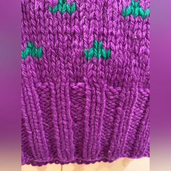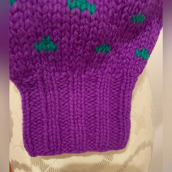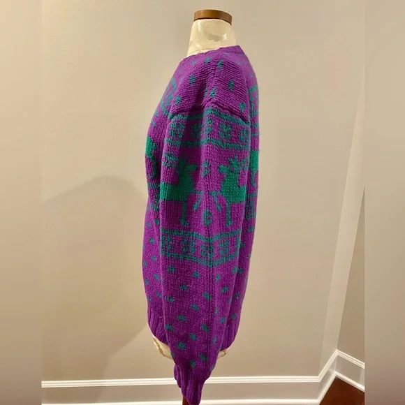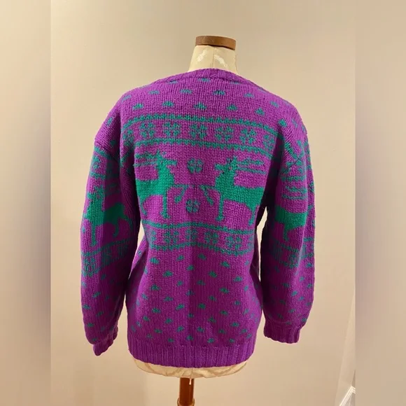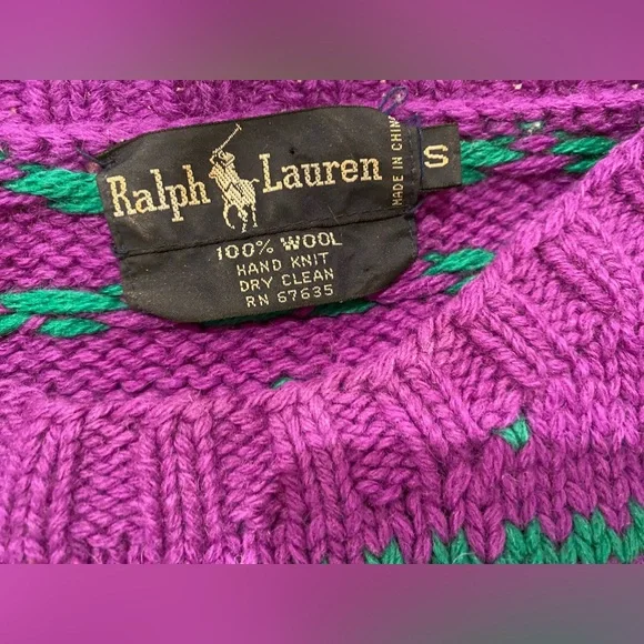 Brrrr.....it's soon to be cold outside! Lovely vintage Ralph Lauren Wool Hand Knit Novelty Reindeer Sweater in beautiful condition from original owner. Crew neck with ribbed collar & cuffsColor is a jewel tone purple and kelly green.Dry clean only. This has always been in my smoke free home. Purchased at Saks Fifth Ave.This is marked small, however, because it is vintage, refer to all measurements hereand compare to something similar you already own for a perfect fit. If you like tolayer, give yourself a little wiggle room.Measurements taken with sweater laying flat:Overall length: 25"Sleeve length: 21-1/2"Should seam to shoulder seam: 17-1/2"Bust ( arm pit to arm pit) : 20"