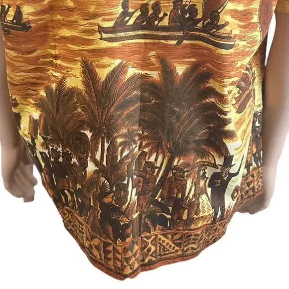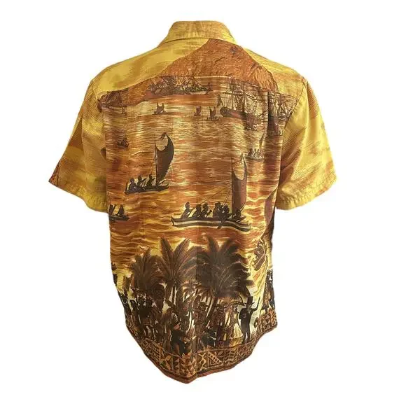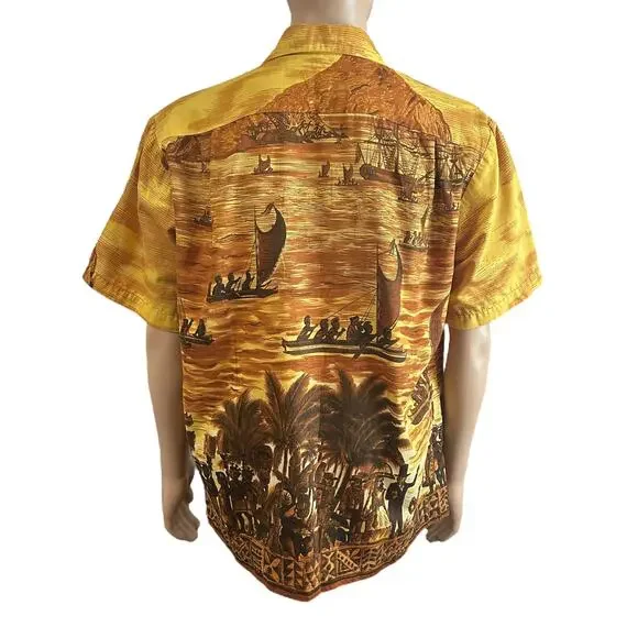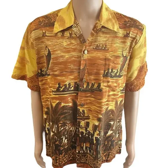 Details:Shape: Button-Up ShirtStyle: Hawaiian, Polynesian, Tropical, Vacation, 70s, Aloha, SurfColor: Brown, Yellow, MultiSize: XL (Chest 48-50")Condition: Preowned, Very GoodPlace Made: Honolulu, HawaiiEra: 1970sMeasurements:Chest: 48-50"Length: 29"Waist: 46"Sleeve Length: 17"*Measurements are approximate and taken flat and doubled where applicable.Additional Features:Intricate Polynesian-Inspired Print – Features canoe scenes, palm trees, and tropical motifs.Metal Tribal Coin Buttons – Unique silver-tone buttons with a warrior’s profileOpen Collar Design – Classic Hawaiian shirt style for a relaxed look.Soft & Breathable Fabric – Ideal for warm weather and tropical settings.