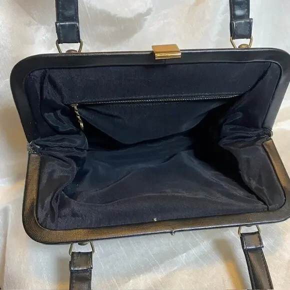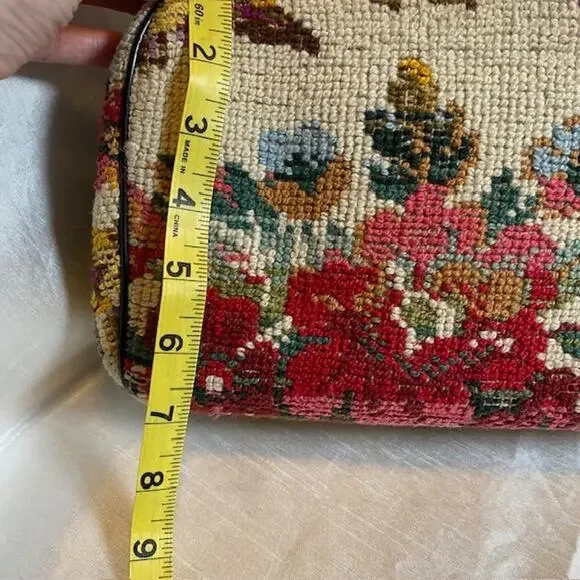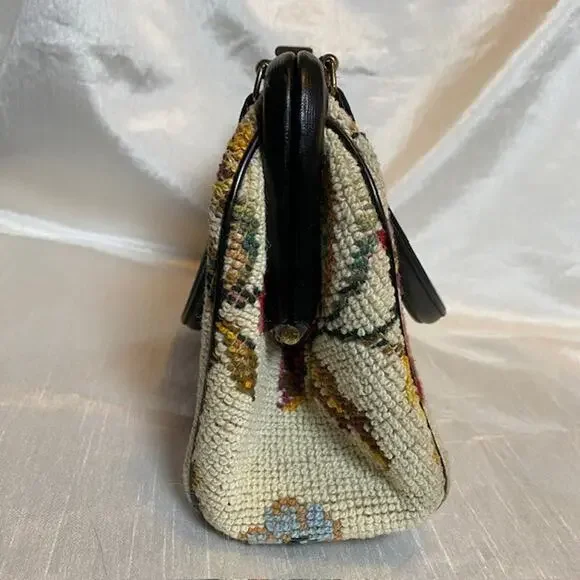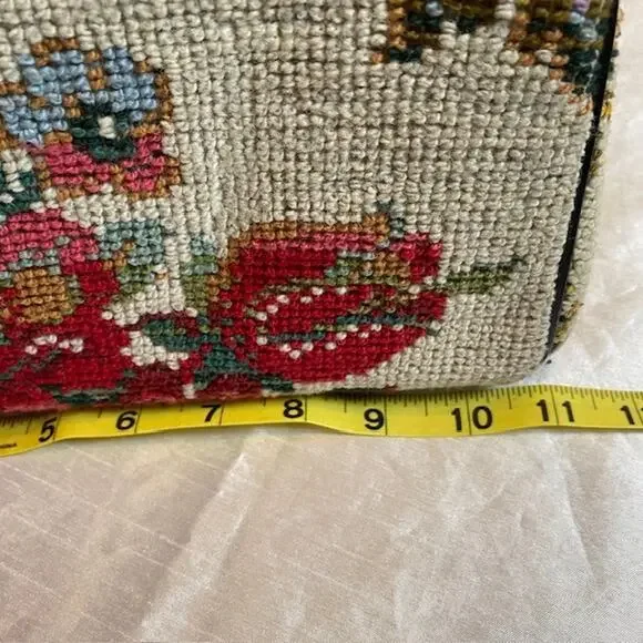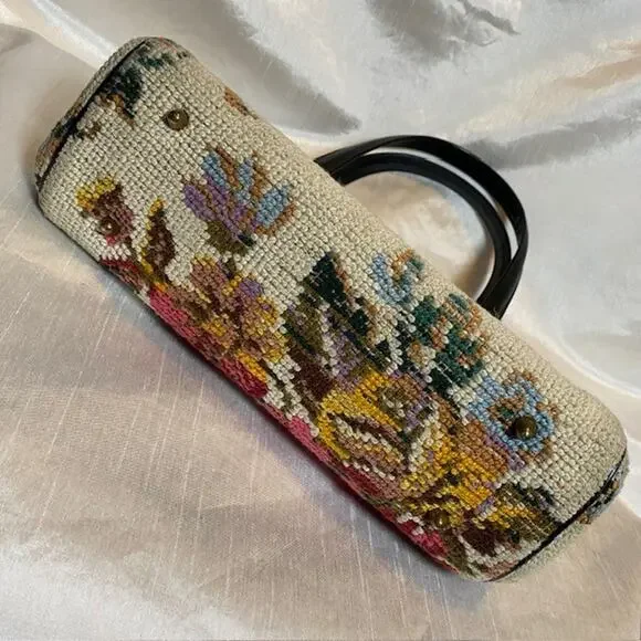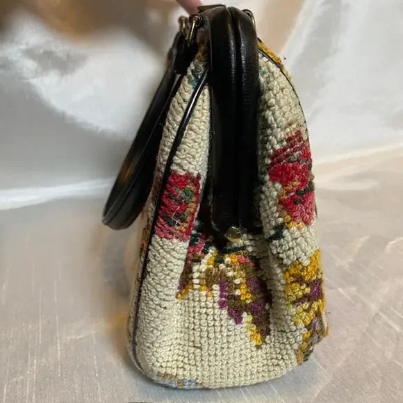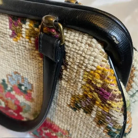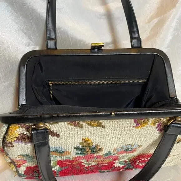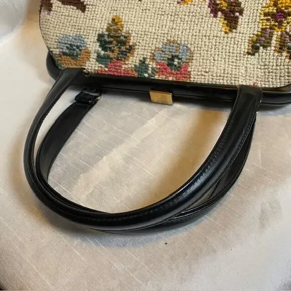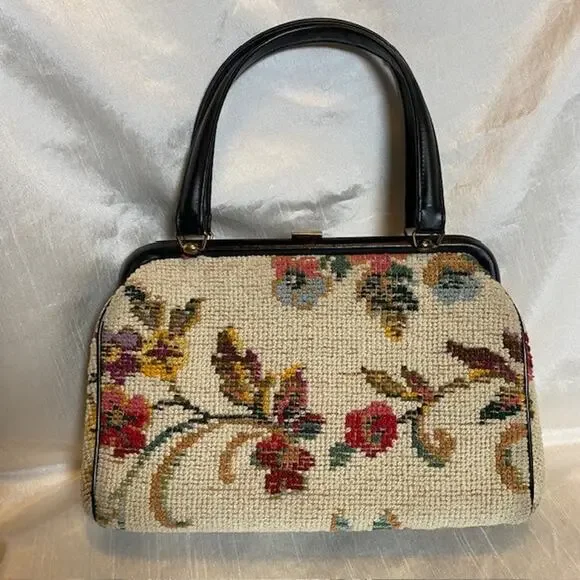 Vintage Tapestry Carpet Floral Fabric Needlepoint 1950's Purse HandbagBlack trim and double handle with gold closure & accents.Step out in style with this authentic vintage tapestry bag, a true testament to the timeless elegance of the 1950s. Crafted with meticulous attention to detail, this needlepoint handbag boasts a vibrant floral fabric that captures the essence of the era's artistic flair.Perfect for everyday use or to elevate your ensemble for a special occasion, this original piece offers a unique Madmen look that's sure to turn heads. The bag's durable tapestry material ensures it's not just a fashion statement, but a piece of history that can endure the test of time.Excellent vintage condition. Very clean throughout. Note very small imperfection on leather closure.11"x7" with 5" double handle drop