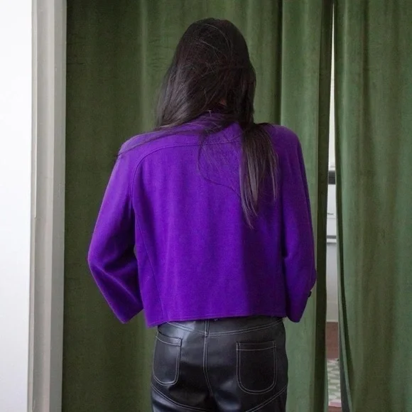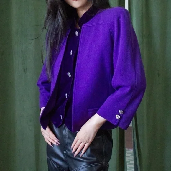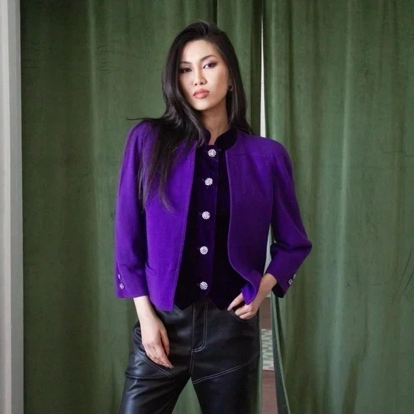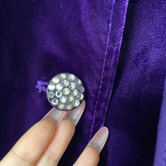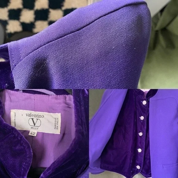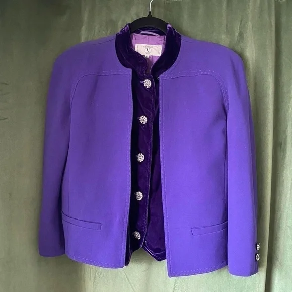 A rare find from the 90s Valentino Miss Vs, this jacket exudes a Purple Rain Prince vibe with its layered design. Crafted with wool on the outside layer and plush velvet on the inside layer, it features gem buttons and shoulder padding for a sophisticated touch. Welt pocket with dart at waist. Mandarin collar style with button closure at the front. Two-button surgeon cuff. Full satin lining in purple. Elevate your wardrobe with this exclusive piece.* 100% Wool, * Dry clean only* Made in Italy Size + Fit* Model is 5'9 and usually wear S, US 2* The jacket is IT 42Condition* Used, in good condition* Some stains/discoloration and fabric snags may present due to vintage condition, some gems are missing from the buttons.* Retail: $2300