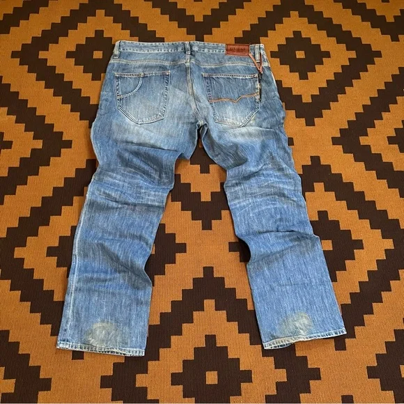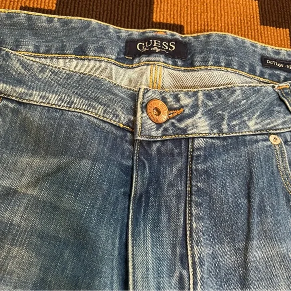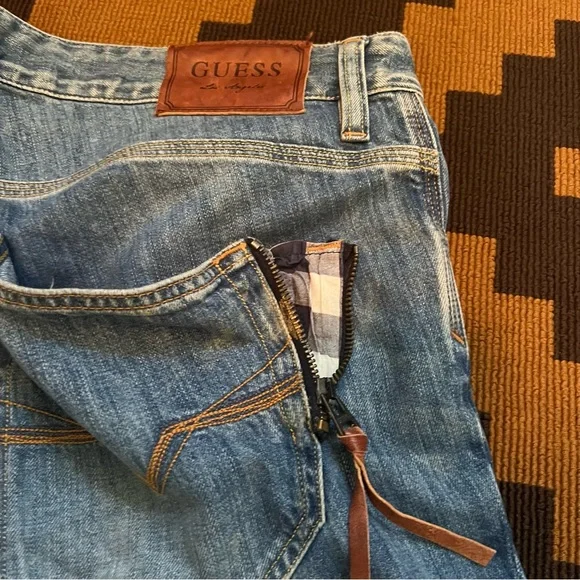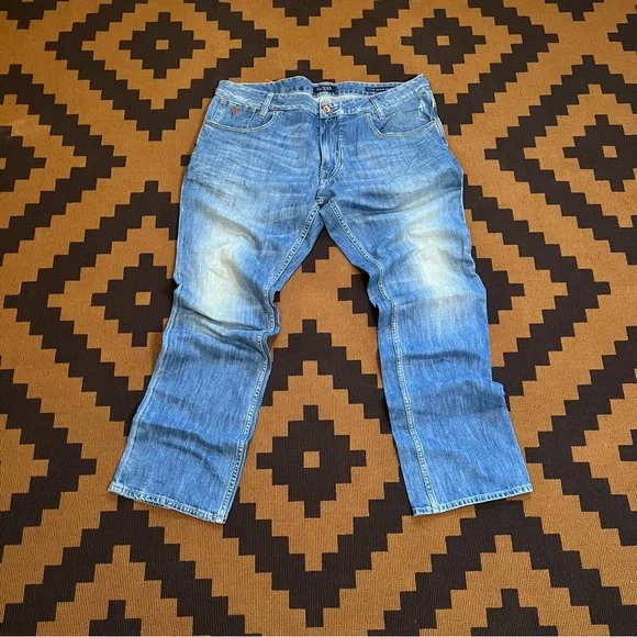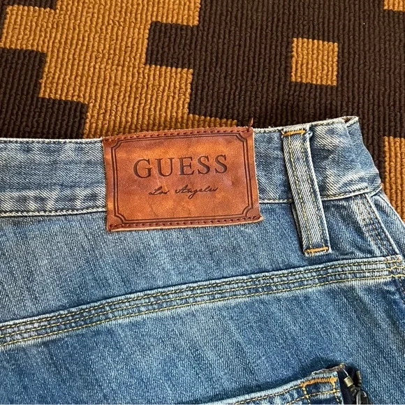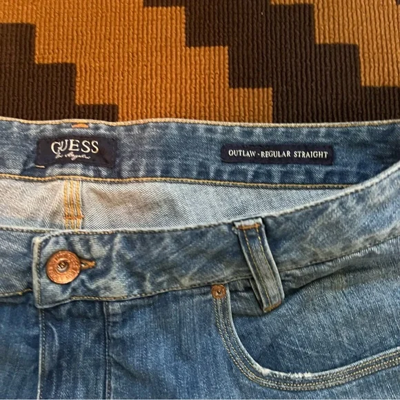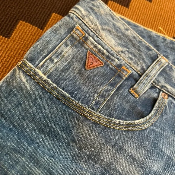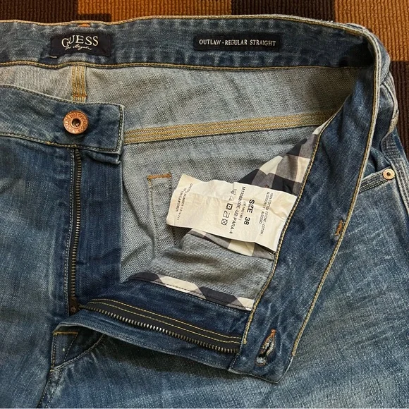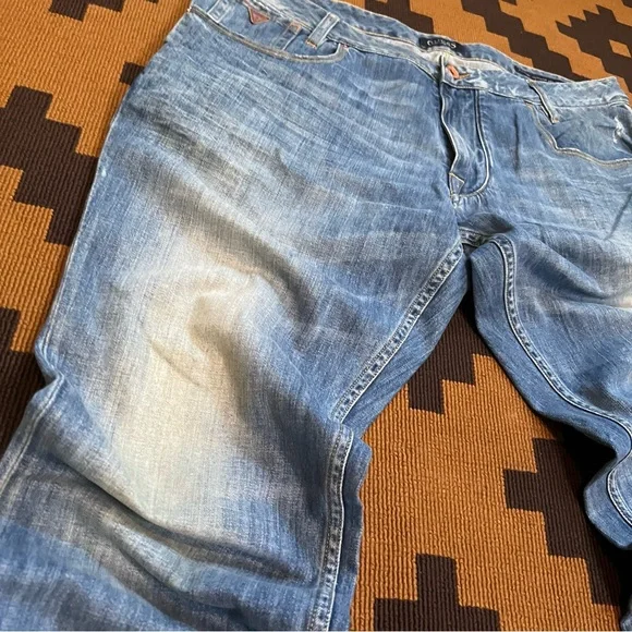 These Guess jeans feature a timeless straight cut in a classic blue hue, perfect for everyday wear. The light wash and subtle whiskering add a casual, worn-in appeal, making them a versatile addition to any wardrobe. Enjoy the comfort and style of these full-length jeans, ideal for any casual occasion.