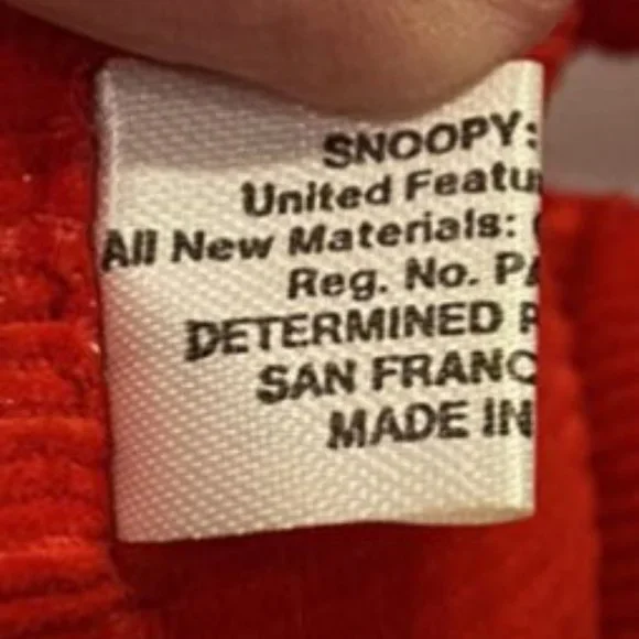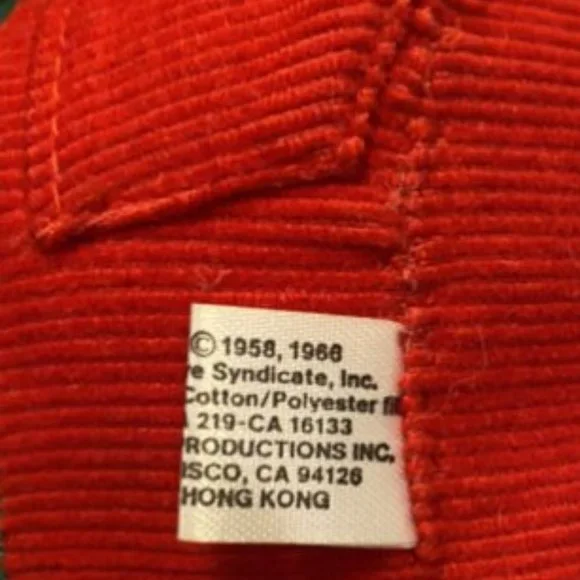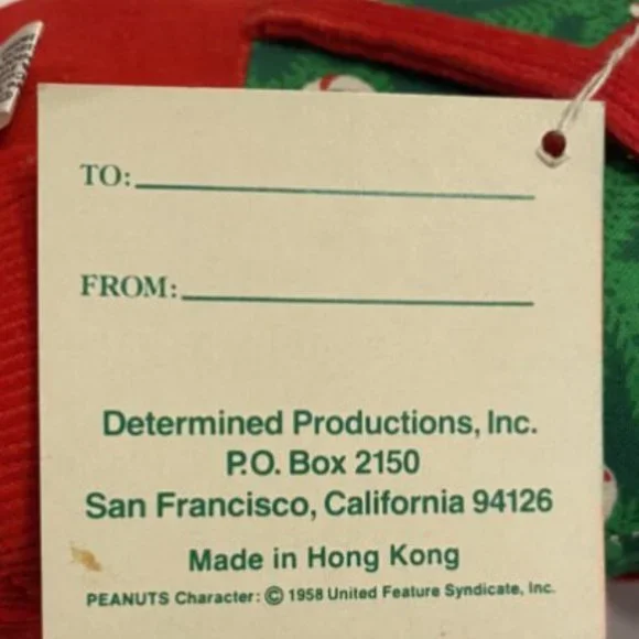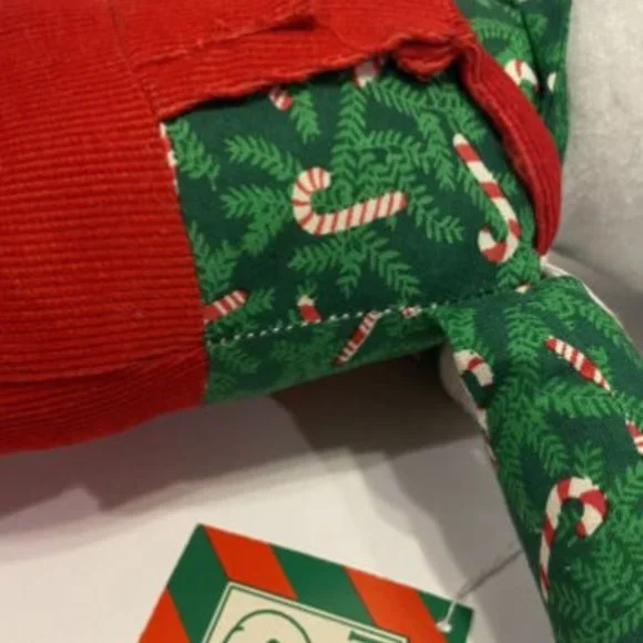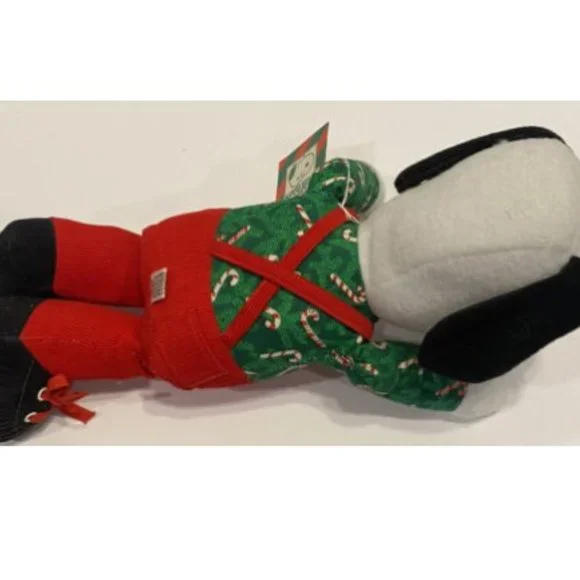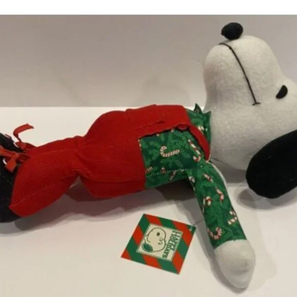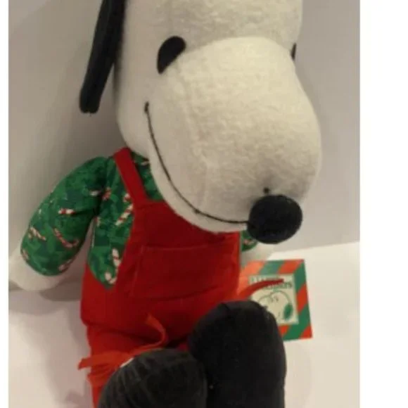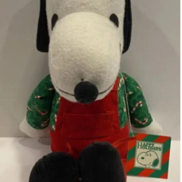 Vintage Happy Holidays Snoopy Plush Toy / Stuffed Animal Wearing non-removable Christmas overalls. Red corduroy pants with candy cane shirtMeasures approximately 13" tallMade in Hong KongExcellent condition with original tagStored in a smoke free home!