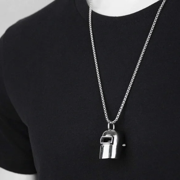 Make a bold statement with this stainless steel welder helmet pendant, paired with a sleek titanium 23.5" chain for lasting durability and modern style. Measuring 1.38” x 1.14” (3.5cm x 2.9cm), this finely crafted pendant brings the spirit of the workshop into everyday fashion.Why You’ll Love It:• Eye-Catching Design – Inspired by real welding gear, the miniature helmet is a head-turning symbol of skill, grit, and individuality.• Built to Last – Made from premium titanium steel, it’s wear-resistant, tarnish-proof, and crafted to stand up to daily wear without fading or bending.• Versatile Style – Designed for both men and women, this necklace adds a bold, industrial edge to any outfit—perfect for parties, casual hangouts, or weekend adventures.• Meaningful Gift – The perfect gift for welders, makers, or anyone who appreciates craftsmanship. Ideal for birthdays, holidays, graduations, or anniversaries. Packaged in a stylish black jewelry card, ready for gifting!