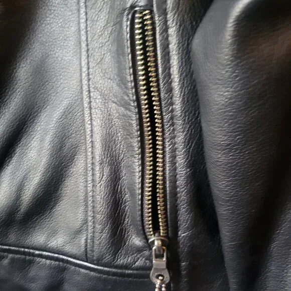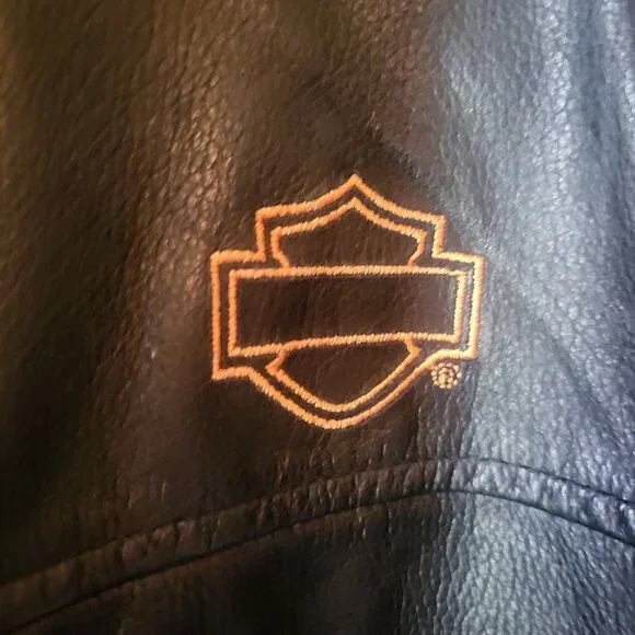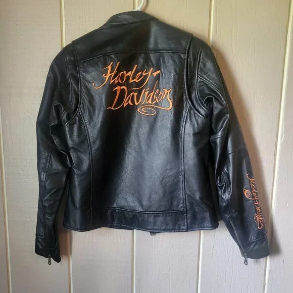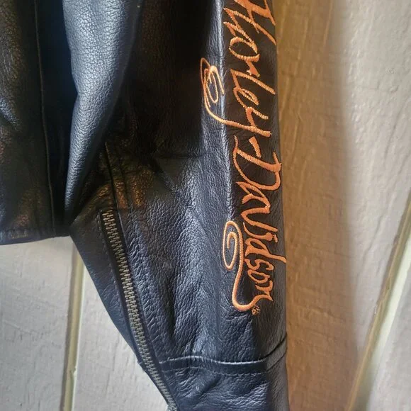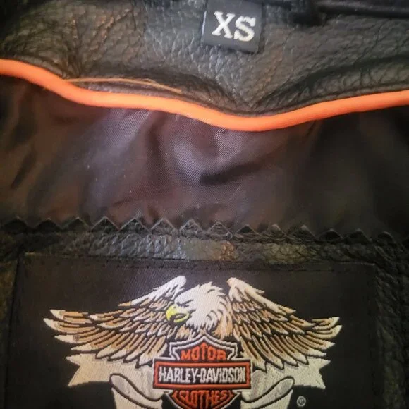 Harley-Davidson, woman's small size genuine leather jacket. Worn only twice.Embroidered, Harley-Davidson tear-drop zip tabsUnique Embroidered logo at the back and sleeve.Brand: Harley DavidsonSize on tag: XSCondition: Excellent Condition, no stains or flaws.Harley DavidsonBlack leather jacket97022-10VW/000SXZip cuffs & pockets2 inner pocketsOrange embroideryMEASUREMENT laying flat(Approximately) in inches:Armpit to armpit : 17 inches - +Shoulder to bottom hem : 22" - +Shoulder Width: 14.5" - +Sleeve Lenght: 24" - +Hem: 18" - +