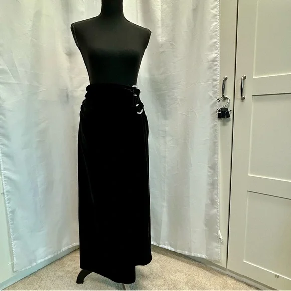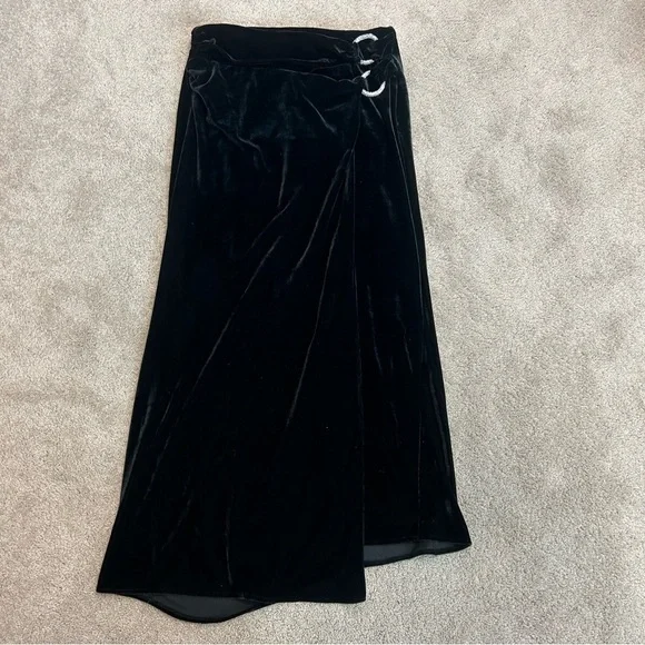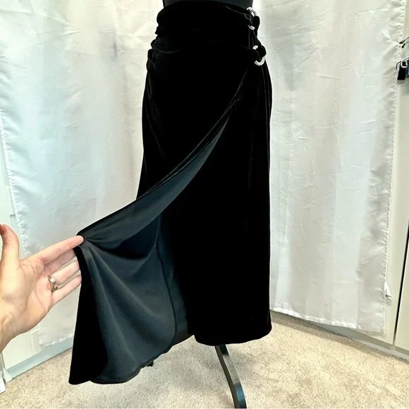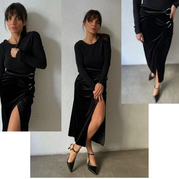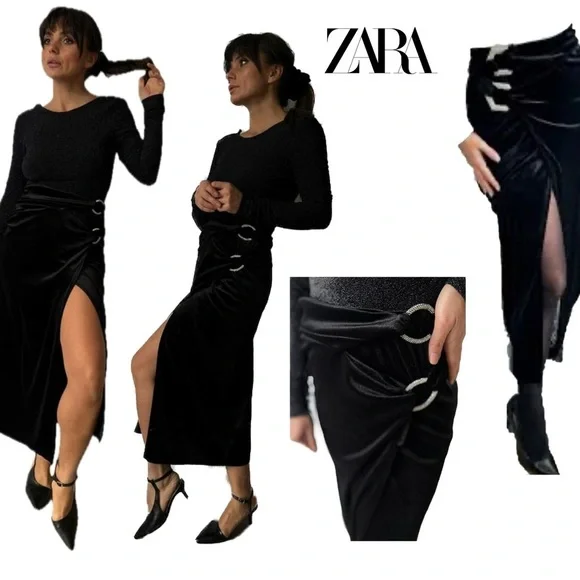 Zara black velvet midi wrap skirt slit side ruching crystal rhinestone buckles MNWOT new without tag. Excellent condition with no flaws. stretchy. Pulls on. Has a high wrap over slit in the front. Side Crystal rhinestone buckles for sparkle.Perfect for Christmas party, wedding guest, New Year’s Eve, Valentine’s Day, Vegas, clubwear, formal events, date night, cocktail party or any other special occasion. Stock photos of models/bloggers are for style reference inspiration only May be slight difference in colour due to lighting. Measurements are approximate, are a courtesy to the buyer & do not guarantee fit. Bundle more through my closet to save on shipping.New to ? Earn $15 🤑 When you sign up with my code: Americanglam ➡️Item recorded to prevent switching of product⬅️ 10720241b3/9pufc
